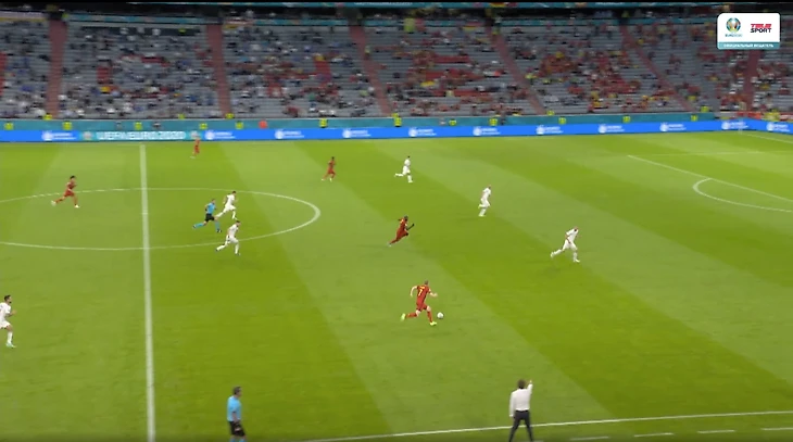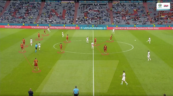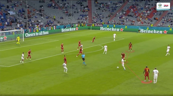 Бельгийцы играли в среднем блоке в типичной формации 5-2-3, но с интересной подстройкой в первой линии: Лукаку занимал без мяча позицию правого нападающего, а на его место в центре переместился де Брёйне. Это было сделано по двум причинам.