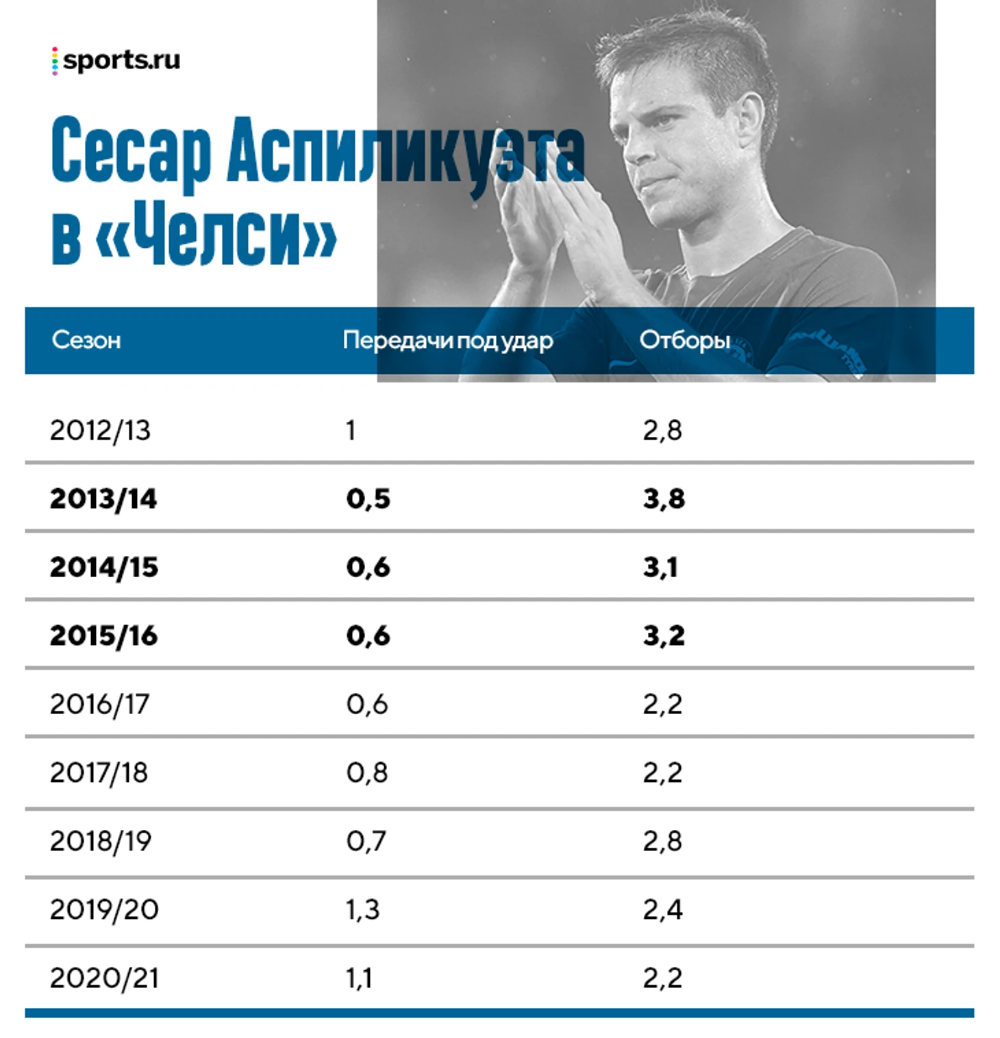 Пик Аспиликуэты в этой роли – сезон-2014/15. «Челси» стал чемпионом, а Азар, освобожденный от обороны, был признан лучшим в АПЛ по версии игроков и журналистов. Специфику роли неплохо передает статистика. Этот трехлетний отрезок – самый объемный для Аспиликуэты с точки зрения единоборств (количество отборов) и при этом наименее объемный с точки зрения атакующей пользы (количество передач под удар).