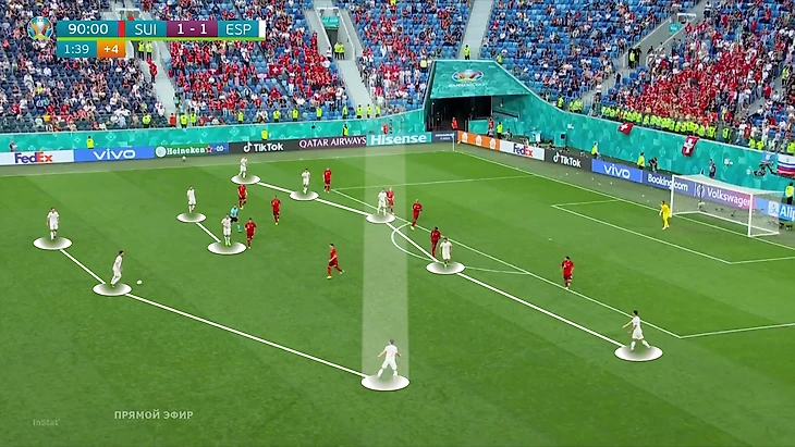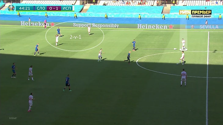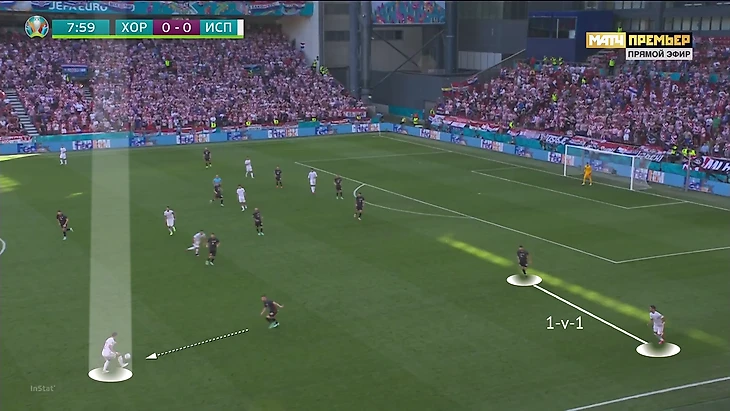 Второе – удар по компактности соперника. Если на Аспиликуэту выдвигается оппонент, испанцы могут создать численный перевес: