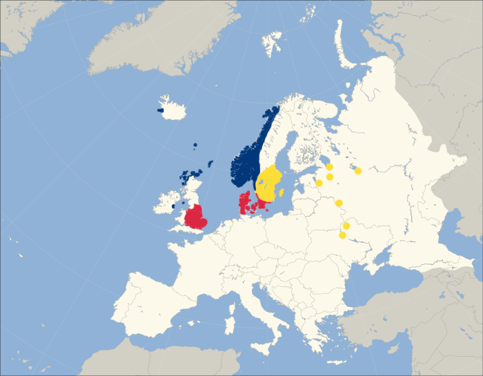 В чем отличие датского права от британского? Например, в уэпентейке собирали комиссии из дворян, чтобы рассматривать дела о нарушении общественного порядка (у англосаксов это было не принято). В Данелаге применялся судебный поединок, а в Англии использовали ордалии (фактически – пытка огнем или водой), чтобы определить виновность. Также в датской части острова было намного больше свободных землевладельцев (сокменов), чем в Англии.
