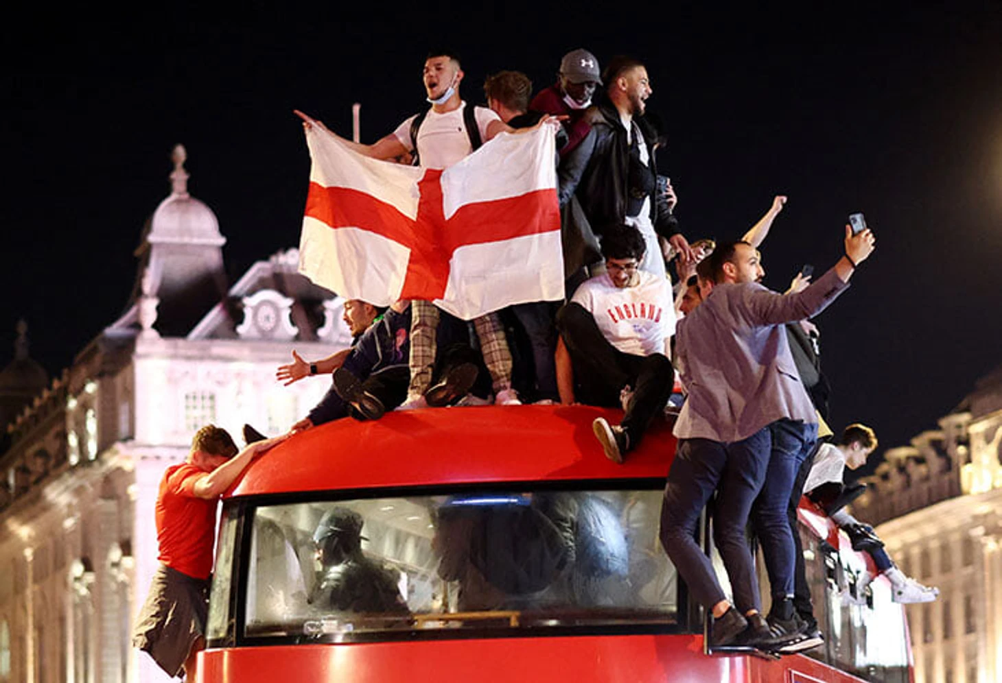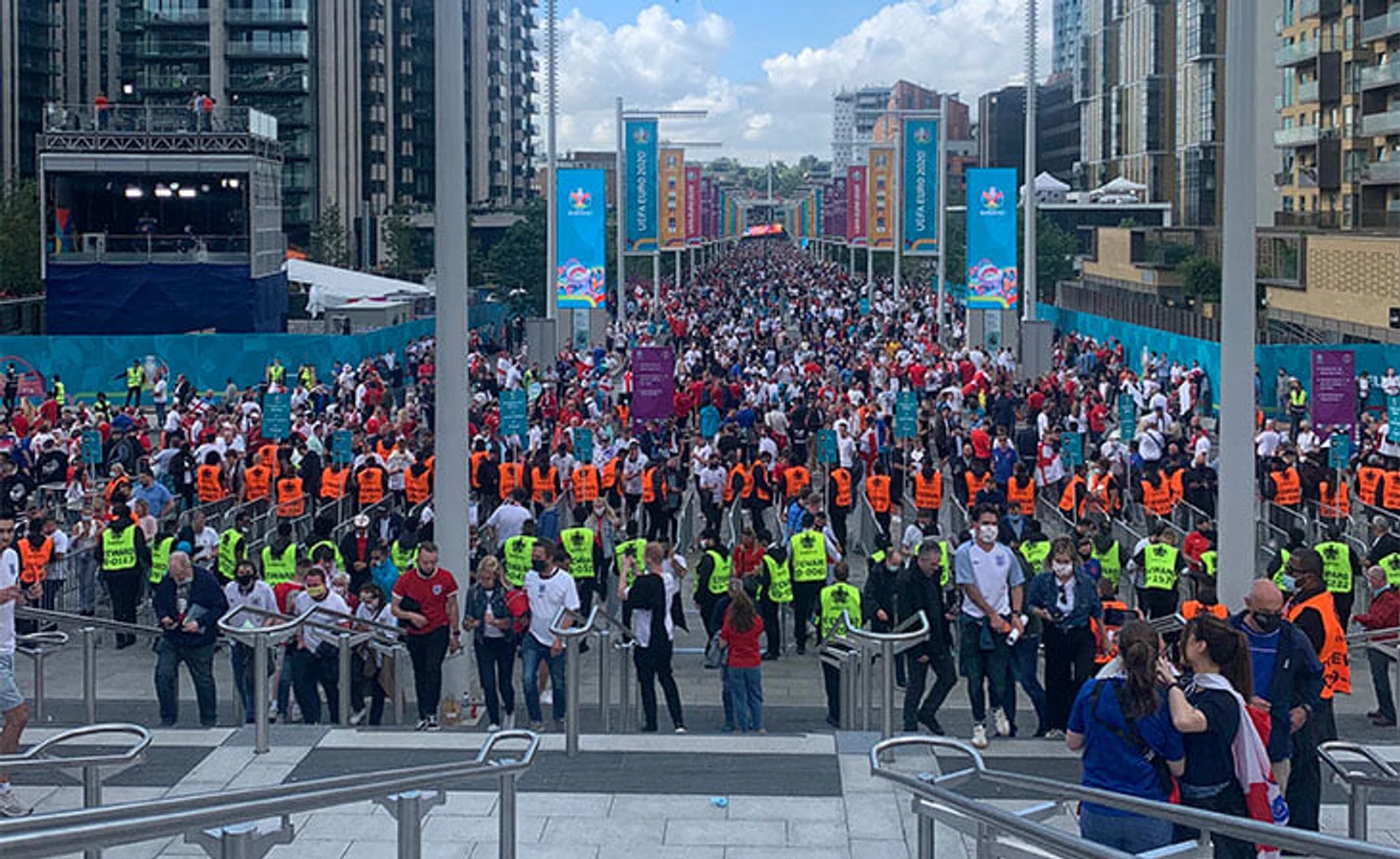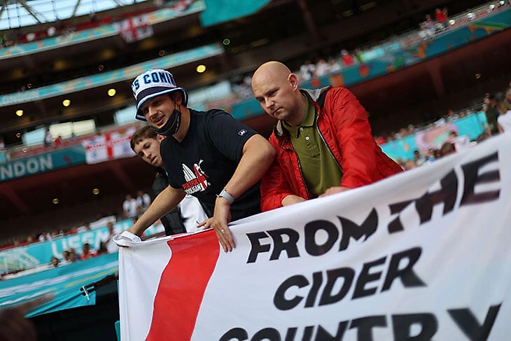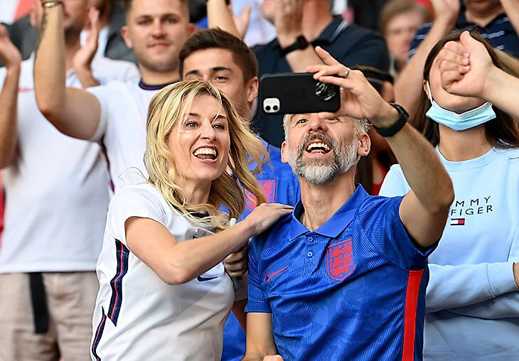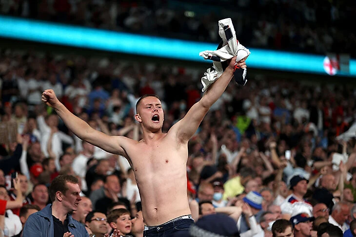 На этой неделе правительство Великобритании объявило, что с 19 июля планирует убрать все короновирусные ограничения, а ношения масок в магазинах и общественном транспорте станет необязательным. Вечер на «Уэмбли» стал путешествием в ближайшее будущее: несмотря на текущие требования, маски снимали почти сразу после прохода досмотра. Если в подтрибунке самые перестраховывающиеся фанаты еще оставались в них, то на секторах людей с закрытыми лицами можно было пересчитать по пальцам.