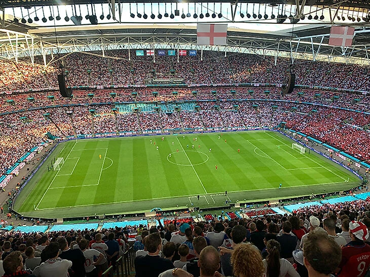 Трибуны «Уэмбли» перед матчем забились настолько плотно, что были сомнения во всего лишь 60-тысячной вместимости. За воротами обосновался красный сектор датчан, размахивающий флагами, а остальной стадион потонул в белых футболках всех возможных эпох.