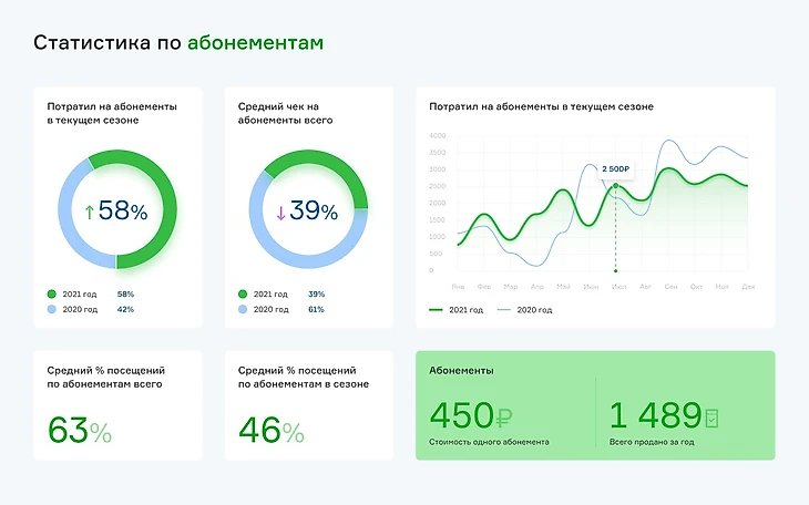 Статистика по абонементам. На графиках и диаграммах видна динамика покупок абонементов, сколько абонементов купили и какой процент посещений матчей по ним.