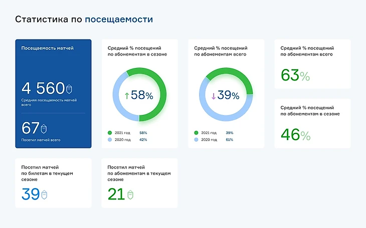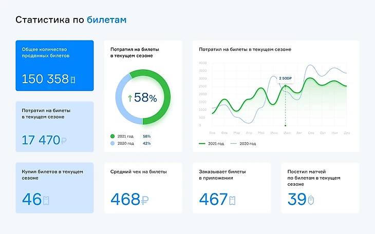Кроме сайтов и приложений, мы разрабатываем CRM-системы для спортивных клубов. Это удобно организованные массивы данных, которые обрабатываются и хранятся в единой системе. Данные компонуются в интерактивные отчёты в заранее заданном виде. Статистика по билетам. По растущему или падающему графику сразу видно, насколько популярны матчи в сезоне, как эффективно работают менеджеры. Отдельными карточками выделены основные показатели: количество проданных билетов в сезоне и всего, средний чек, сколько людей пришло на матчи.