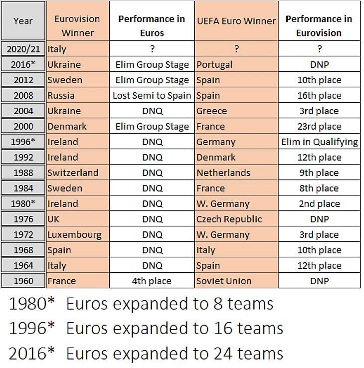 Но ни разу страна, чей представитель побеждал на Евровидении, не выигрывала Евро в тот год. До 2021-го.