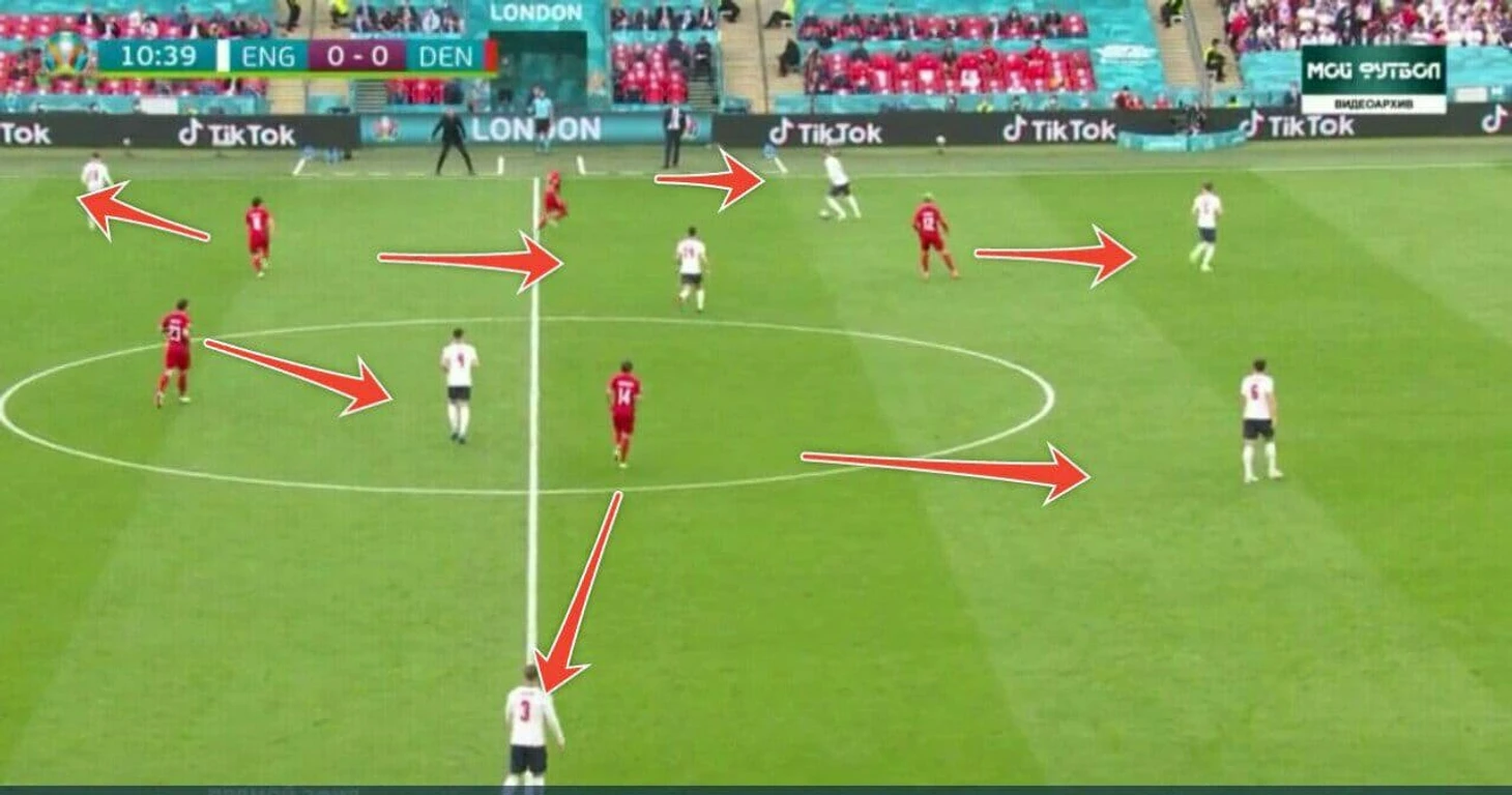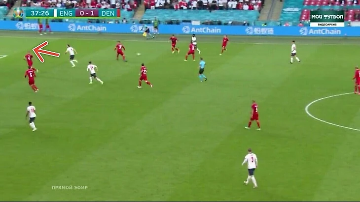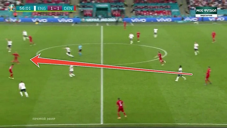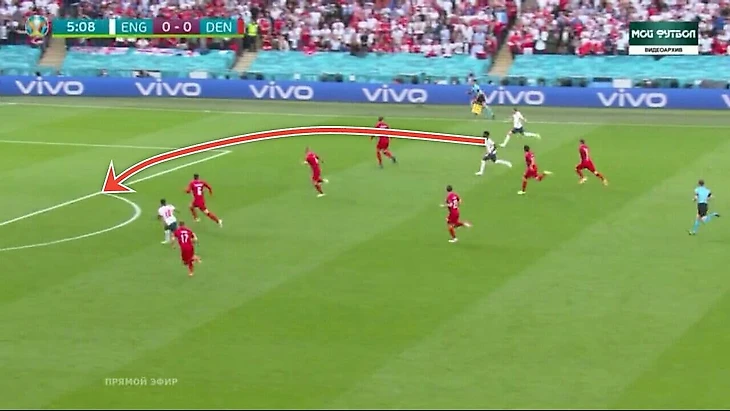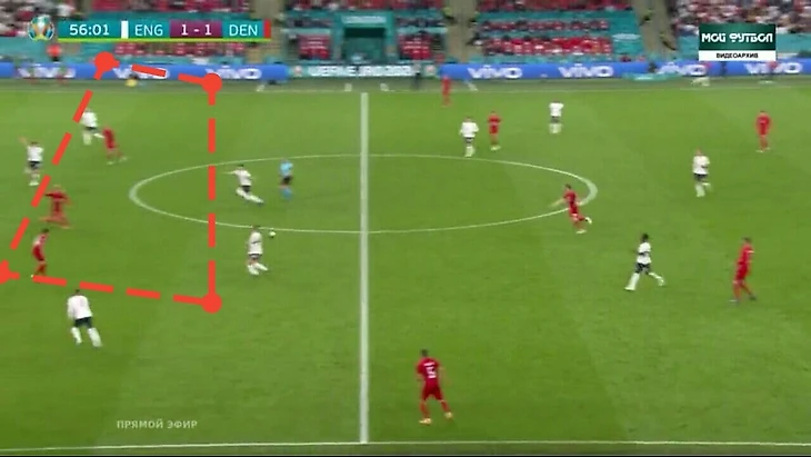 А ещё дания продвигала мяч через латераля Стригера,за которым Шоу иногда не успевал.Но опять же,мяч продвигался,но там ничего не сумели создать,защитники Англии дико хорошие.