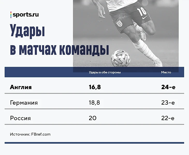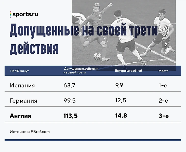 Качественная структура помогает Англии максимально редко пускать соперника в острые зоны. По допущенным действиям на своей трети они уступают только Испании и Германии: