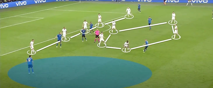 Угловой и сумбур после его исполнения привел голу, который вытекал из хода игры. Саутгейт слишком рано перестраховался и совершенно забыл о собственных атаках. Владение мячом упало до 31%. Пропустив мяч, главный тренер сборной Англии решил перестроиться и на 70-ой минуте выпустил Букайо Сака вместо Триппье, перейдя в схему с 4 защитниками. Данное решение помогло сбить темп итальянцев и вернуть контроль над игрой.