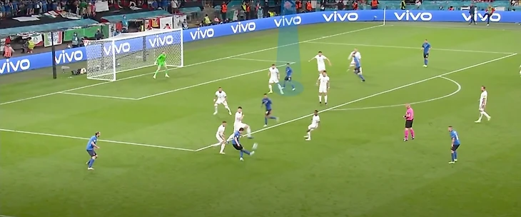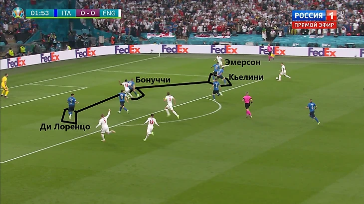 В завершающей стадии атаки правый латераль Триппьер выдернул на себя центрального защитника Кьеллини, который пришел на помощь Эмерсону. Ди Лоренцо было необходимо подстраховать опытного партнера и занять его позицию, сместившись с фланга ближе к центру, чтобы накрыть набегающих Стерлинга и Кейна. Левый защитник не учел тот факт, что сборная Англии активно использует фланги при игре в 3-4-2-1, и Люк Шоу непременно воспользовался недочетом итальянского защитника.