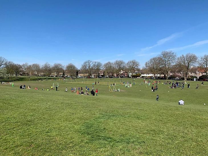 Спускаясь с верхней части парка, ниже можно увидеть теннисные корты и манеж, а также оказаться в широком открытом зеленом пространстве, которое ждет, пока его заполнят юные футболисты.