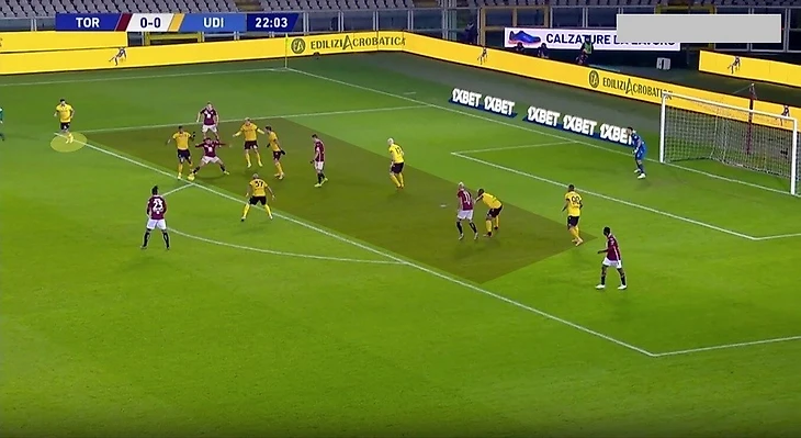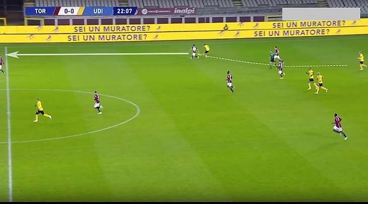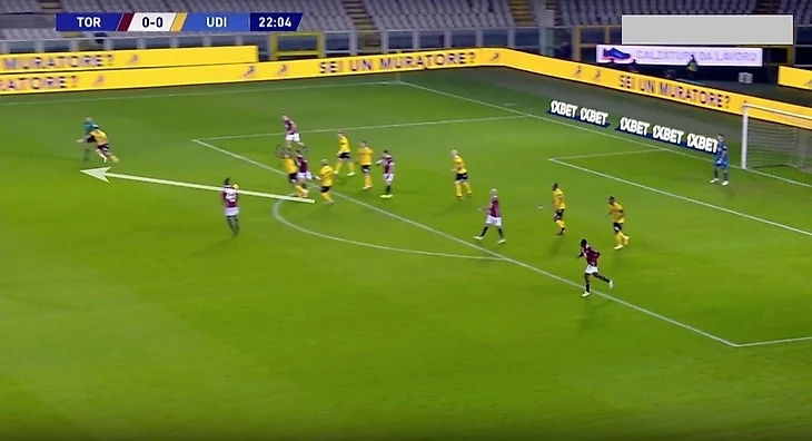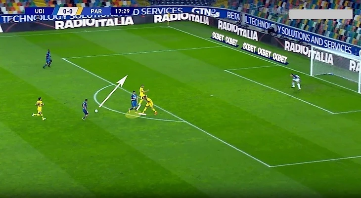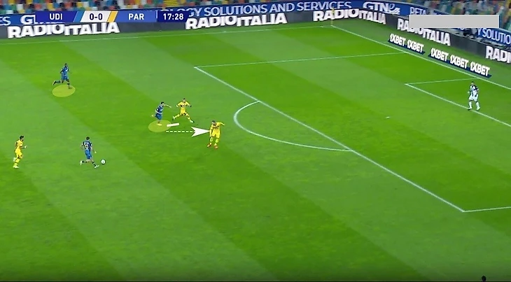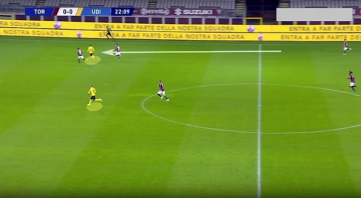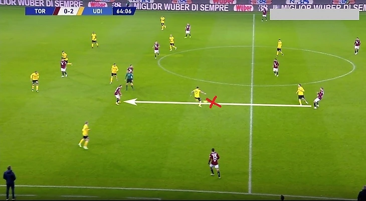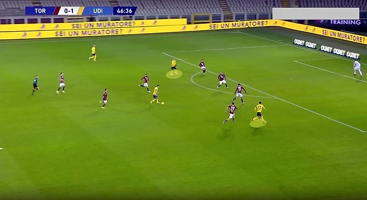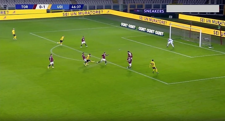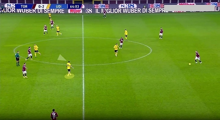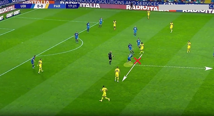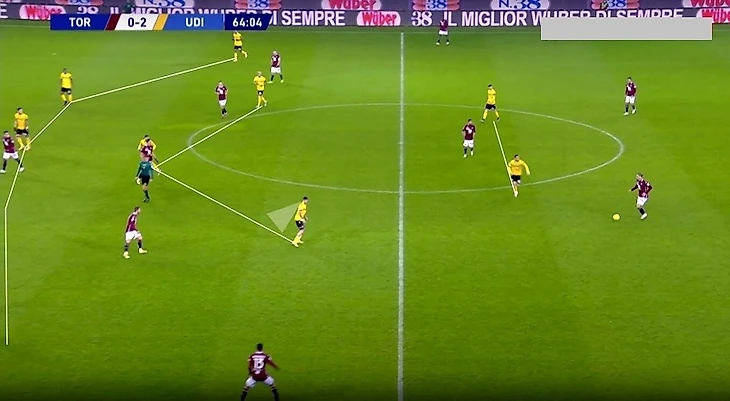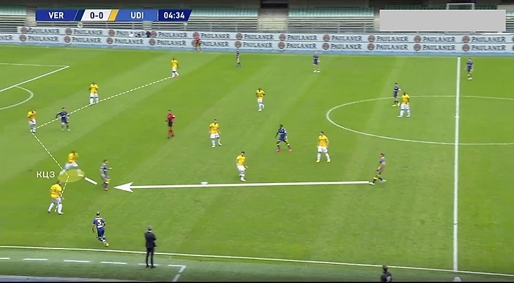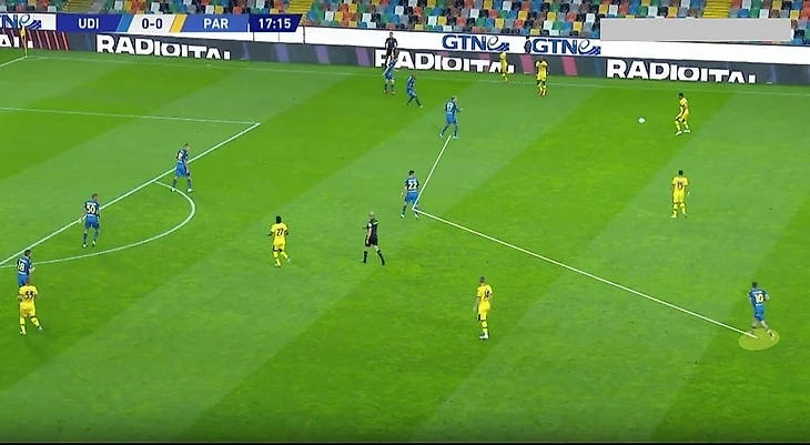 В современном футболе оборона начинается с первой линии команды – с нападающих, и «Удинезе» не исключение, правда они не используют контрпрессинг, а встречают соперника в компактном блоке 5-3-2 в районе середины поля. Эта схема работает как отлаженный механизм, все игроки чётко понимают свои роли. Оба нападающих проделывают большой объем беговой работы, выдавливая соперника из центра поля во фланговую ловушку, где к мячу синхронно смещается вся тройка полузащиты.