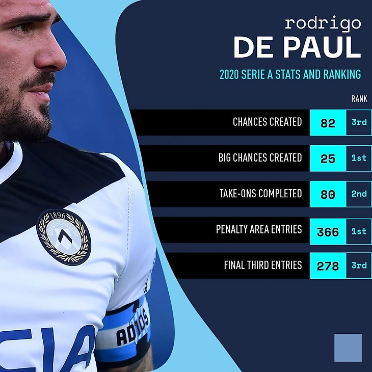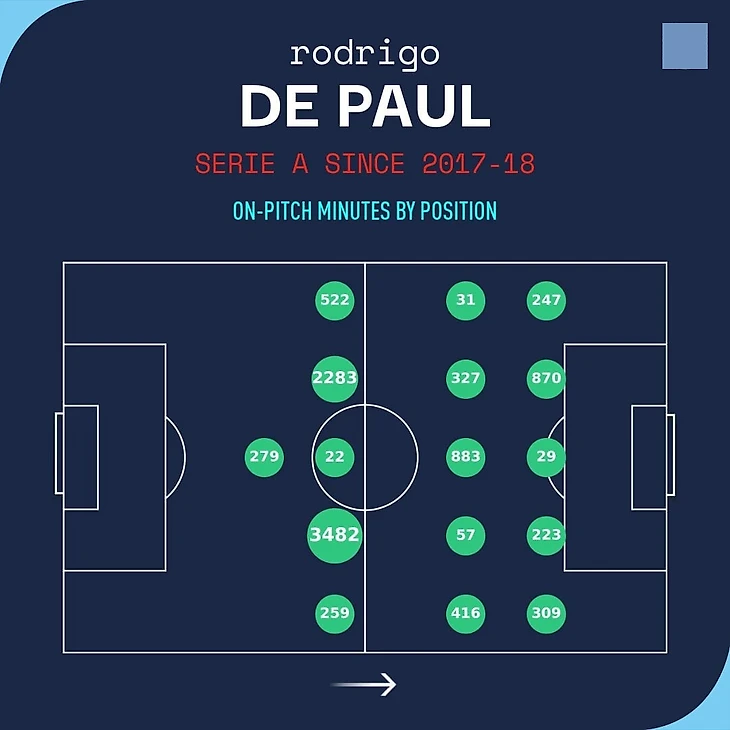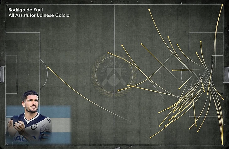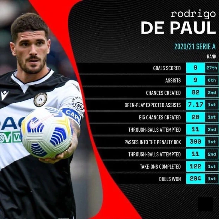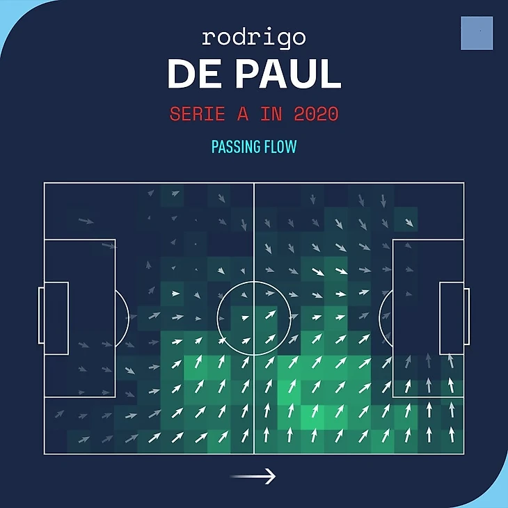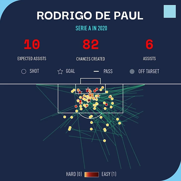 Также де Пауль создает огромное количество ситуаций для удара, активно вовлекаясь в билд-ап. Его показатель в 68 действий, ведущих непосредственно к удару, уступает только Хакану Чалханоглу, лучшему созидателю Серии А в этом сезоне.