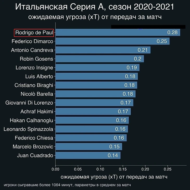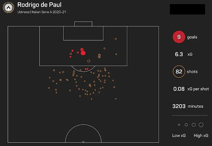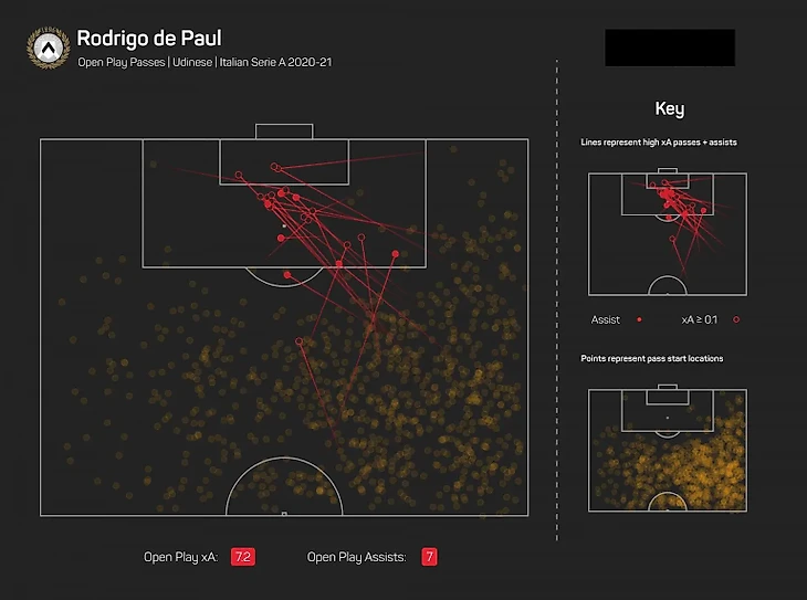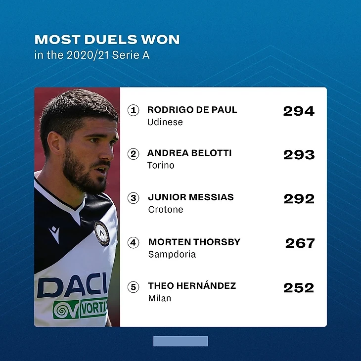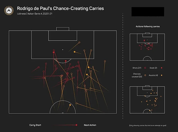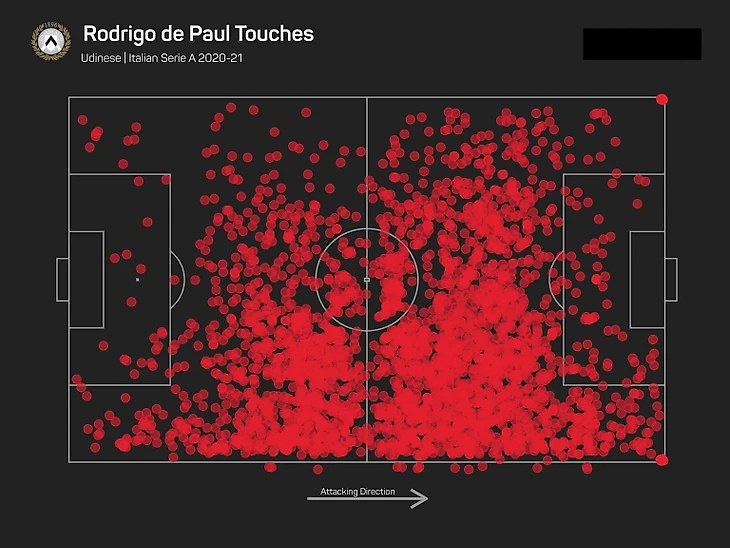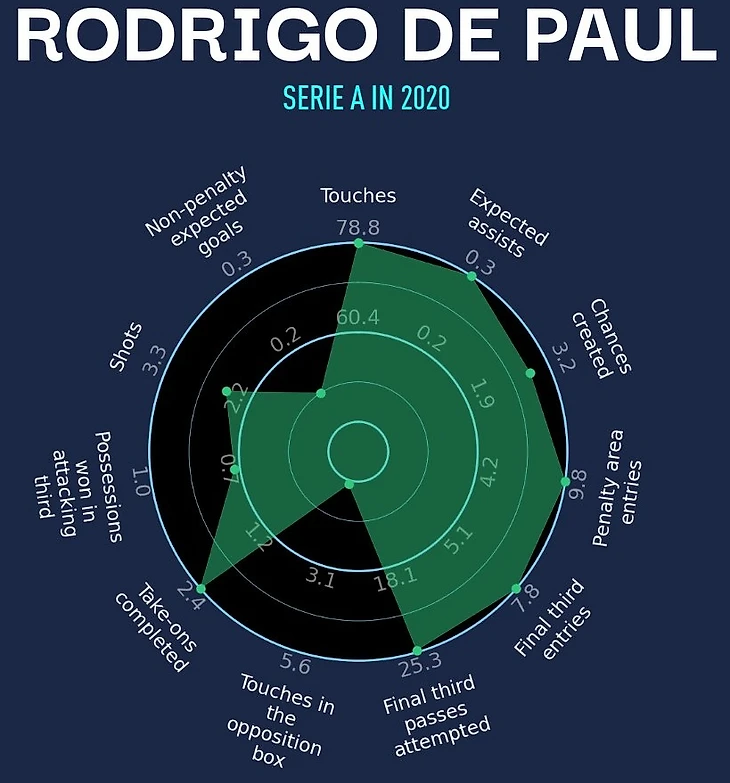 Также де Пауль создает огромное количество ситуаций для удара, активно вовлекаясь в билд-ап. Его показатель в 68 действий, ведущих непосредственно к удару, уступает только Хакану Чалханоглу, лучшему созидателю Серии А в этом сезоне.