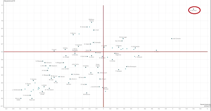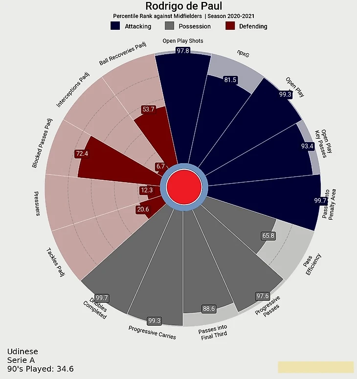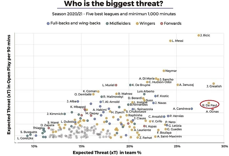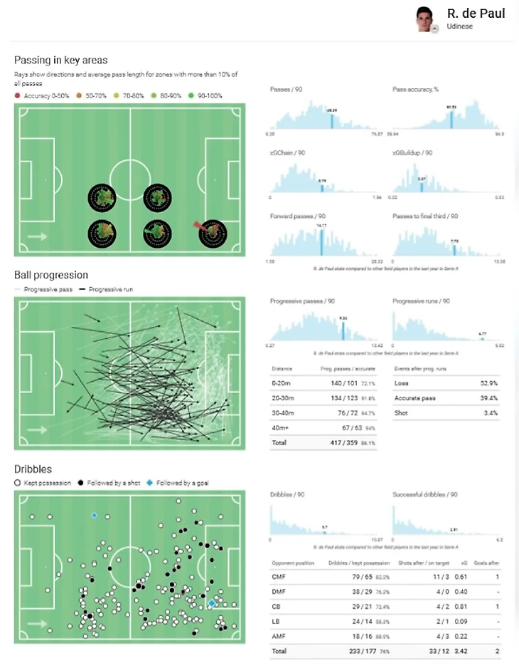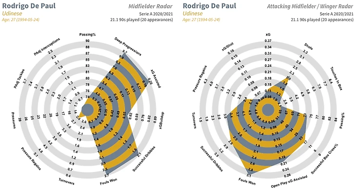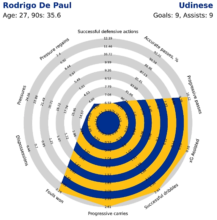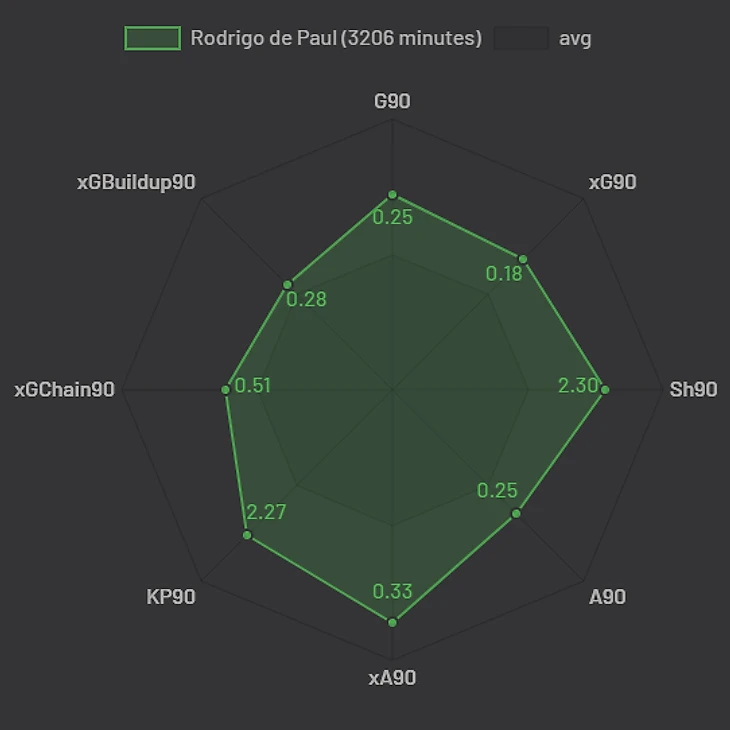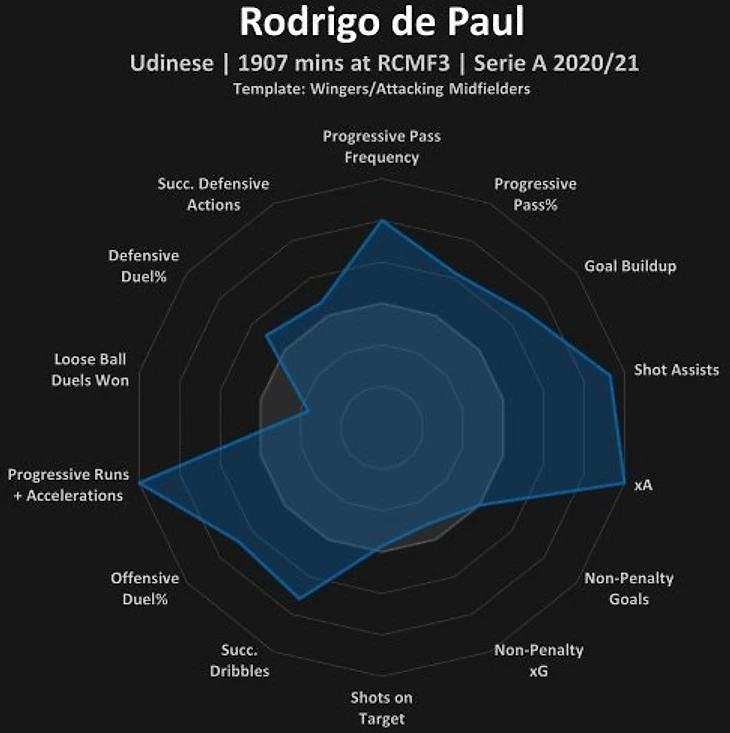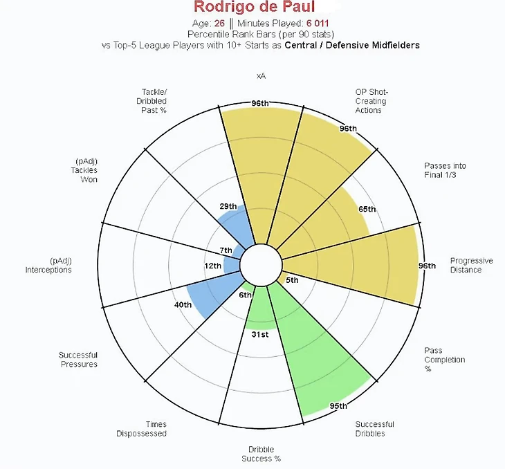Аргентинец одновременно хорош и в продвижении мяча, и в доставке мяча в финальную треть, и в передачах в штрафную площадь соперника. В любых метриках де Пауль присутствует в числе лучших по Европе уже несколько сезонов подряд.