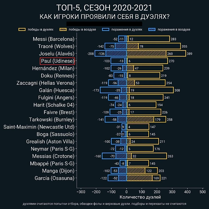 При этом у аргентинца, как для креативного игрока, основная задача которого конструировать игру в атаке, достаточно неплохие цифры по отборам (1,2 за 90 минут) и перехватам (0,5 за 90 минут). Благодаря резкости де Пауль может сразу накрыть оппонента при малейшей технической помарке (60% выигранных единоборств), такие эпизоды он отлично чувствует. Также он часто приходит на помощь партнеру, быстро создавая ситуацию 2 в 1, и за счёт цепкости выгрызает мяч для своей команды.