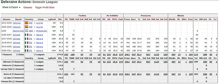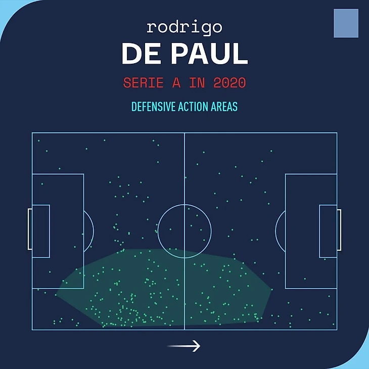 Де Пауль не умеет прессинговать, а вместо этого стремится занять полезное пространство, в котором можно находиться на случай быстрой ответной атаки. Чуть более двух оборонительных действий в среднем за 90 минут в сезоне 2020/2021 отражают его пассивную оборонительную природу.