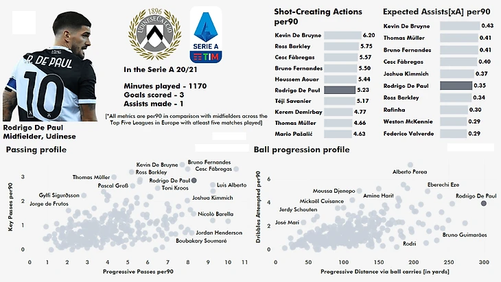 В лице «десятки» «Удинезе» мы имеем техничного и атлетичного вингера c роскошным дальним ударом, который перешёл в центр поля и в итоге научился играть повсюду. Де Пауль очень хорошо и много обводит. У него быстрые ноги, прекрасная координация. Он, как Месси, держит мяч на поводке – и не даёт сопернику прикоснуться. Быстро меняет траекторию движения за счёт координации. При этом он сам по себе быстрый – и на старте, и на дистанции. Также де Пауль является лучшим по единоборствам во всей Серии А, несмотря на то, что Родриго весьма креативный игрок, он и отлично отрабатывает в обороне, что очень ценится в системе Симеоне.