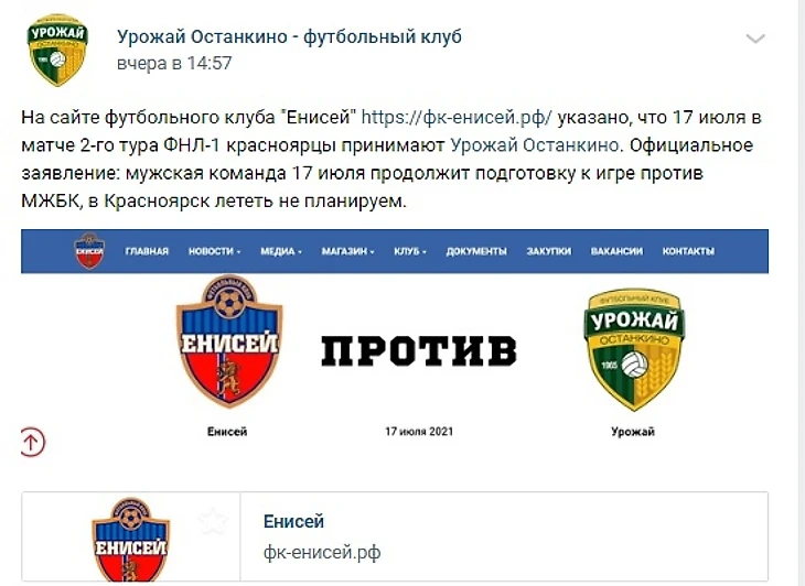 И при этом «Енисей» сохранял спокойствие. Язвительно-нейтральные комментарии в официальных соцсетях тщательно затирались, время шло, а логотип «Урожая» из посёлка Останкино продолжал украшать красно-синюю страницу. Получился своеобразный пиар — правда, не себя, а соперника: болельщики «Енисея» стали больше узнавать о неожиданном сопернике. И накопали много интересной информации.