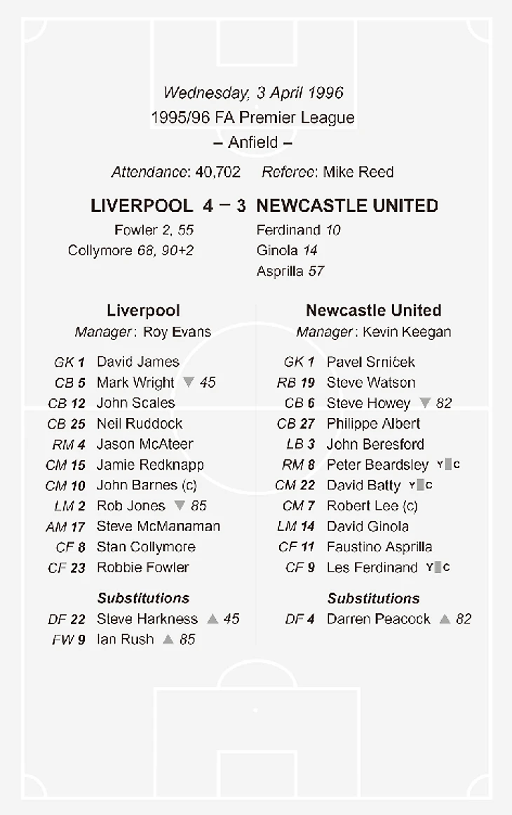 Перепутьем для этого «Ливерпуля» стала кульминация сезона 1995/96, когда у них был шанс выиграть Кубок Англии и сделать Дубль, победив в Премьер-лиге. В воскресенье, 31 марта, они обыграли «Астон Виллу» со счетом 3:0 на «Олд Траффорд» в полуфинале Кубка Англии. Защищая непобедимую двадцатидвухматчевую серию в чемпионате, в следующую среду они приветствовали соперников на титул «Ньюкасл Юнайтед» на «Энфилде» для игры, которую многие считают величайшей в истории Премьер-лиги.