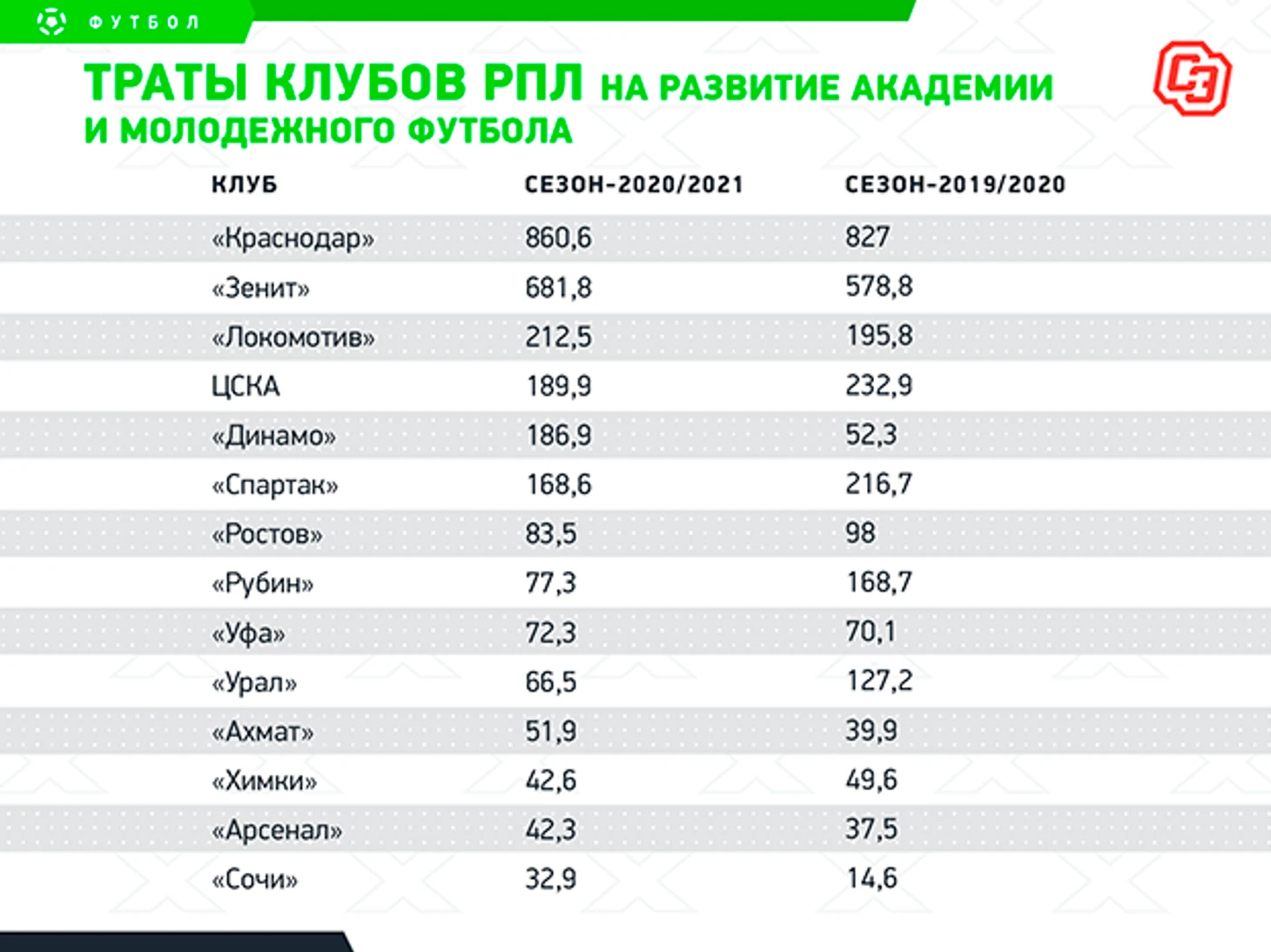 Больше всех вложил в развитие академии и молодежного футбола «Краснодар» — 860,6 миллиона рублей. На втором месте «Зенит» (681,8). А вот «Спартак» тратит на молодое поколение все меньше и меньше: в прошлом году было 216,7 миллиона рублей, в этом — уже 168,6. Даже цска и «Динамо» вложили больше (189,9 и 186,9 соответственно), при том что у них, в отличие от красно-белых, нет второй команды, выступающей в ФНЛ.