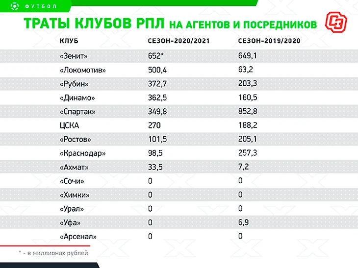 В последние годы «Спартак» привыкли ругать за большие траты на агентов. Однако в прошедшем сезоне больше всех денег на посредников потратил «Зенит» — 652 миллиона рублей. Это почти в два раза больше, чем у «Спартака» (349,8).