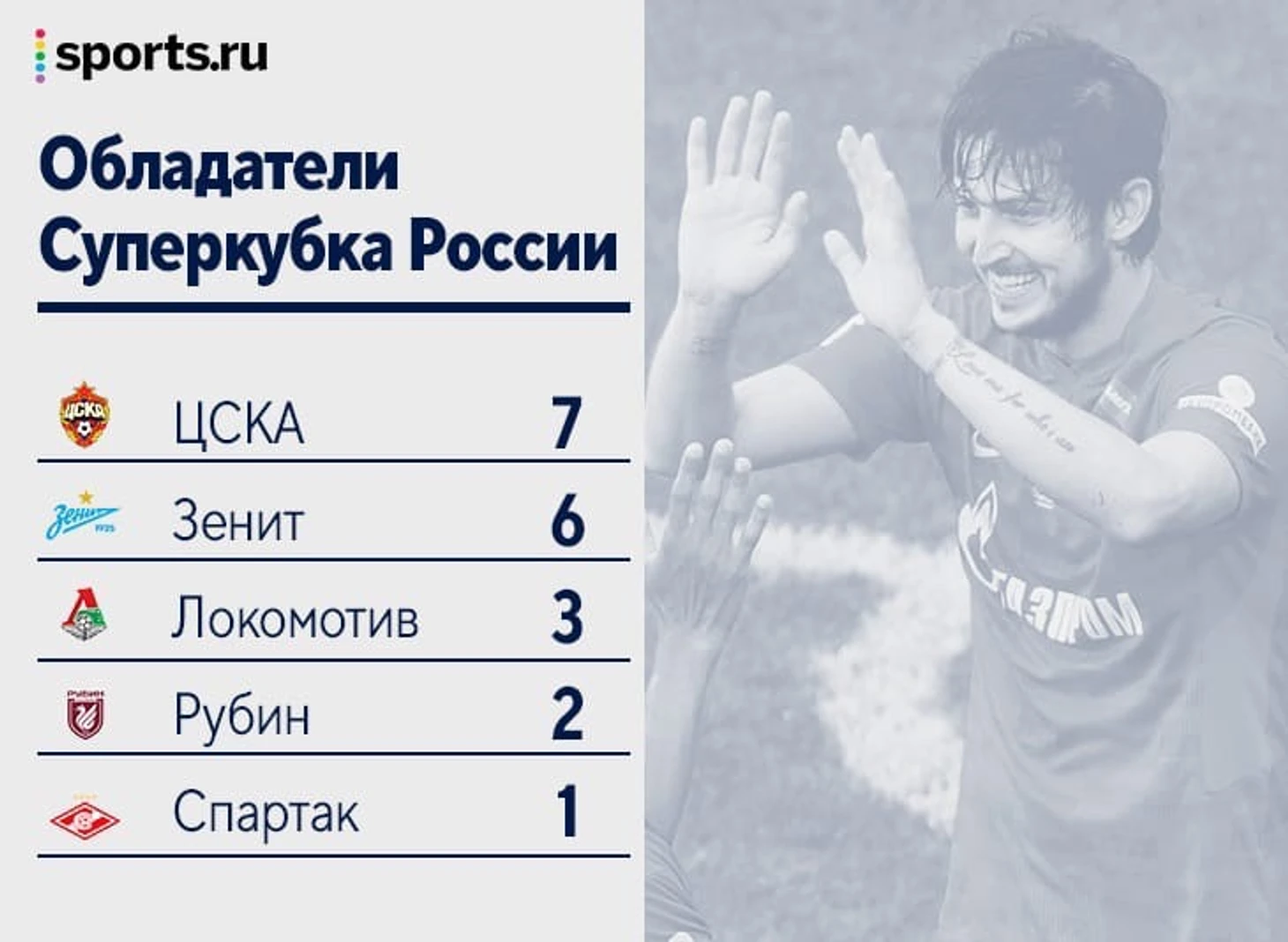 Зенит победил и выиграл в своей истории 6 суперкубок. До рекорда ЦСКА остался еще один трофей - у них 7.