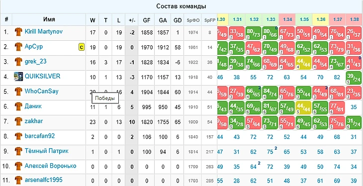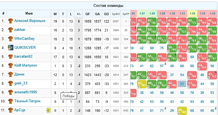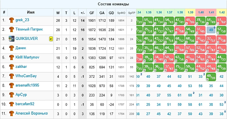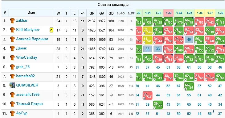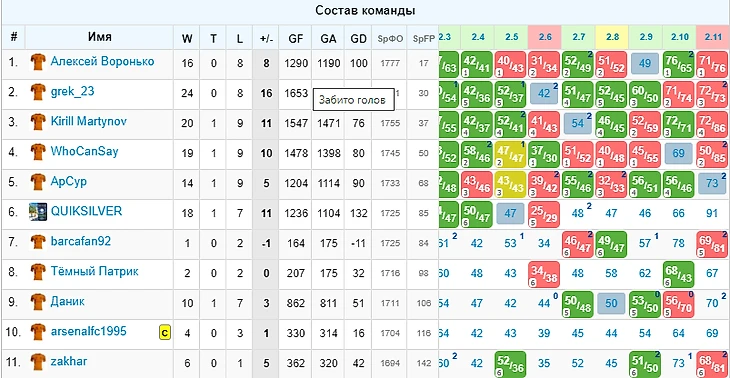 Лучший бомбардир команды - grek_23 c 24 мячами. Лучший в ОЗ - Алексей Воронько, 8 игроков закончили в топ-100.