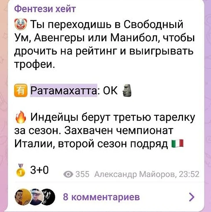 После завершения сезона один из наших игроков Андрей arsenalfc1995 принял решение сократить количество играемых чемпионатов и сделать перерыв в командном Н2Н. Андрей провел в команде 4 года, при его участии были выграны все наши трофеи. Свой высокий уровень arsenalfc1995 подтвердил в летних турнирах, в рейтинге Анисимова по летним турнирам занял 5 место среди всех игроков, до последнего тура боролся за звезду в Кубке Америки. Благодарим Андрея за 4 крутых сезона в составе Ратамахатты!