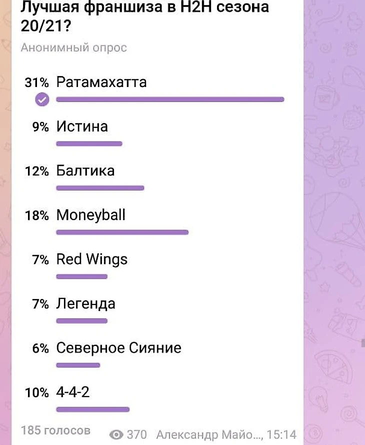 Результаты голосования по лучшей франшизе в Н2Н сезоне 2020/21 в телеграм-канале Фентези хейт: