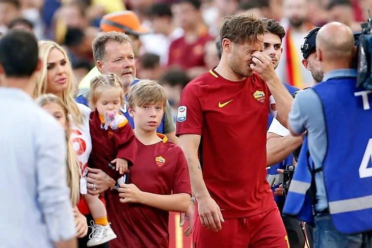 "Вот мы и подошли к этому моменту. К сожалению. Надеялся, что это никогда не произойдёт. В последние дни обо мне было сказано много хорошего. Вы поддерживали меня во время трудных моментов, поэтому хочу поблагодарить вас за это. Я плакал, как сумасшедший! Нельзя просто взять и забыть все эти годы. Я благодарю всех. Невозможно пересказать 28 лет в нескольких фразах. Хотел бы сделать это песней или поэмой, но я не очень силён в этом. Пытался объяснить это с помощью своих ног, потому что это кажется мне более простым способом. Чёрт побери, время! Оно пролетело так быстро с победы в чемпионате Италии 17 июня 2001 года. Тогда я не мог дождаться финального свистка арбитра. Воспоминание об этом до сих пор вызывает у меня мурашки. Теперь время пришло, похлопало меня по плечу и сказало, что завтра мне пора повзрослеть. Мне нравится думать о своей карьере как о сказке. А сегодня её худшая часть. Теперь действительно всё кончено. Я сниму футболку в последний раз и аккуратно её сложу. Даже если мне придётся с этим смириться, я не готов сказать, что всё кончено, и, возможно, никогда не буду готов. Извините, что в последнее время я не давал интервью и не вносил ясность. Мне было не просто погасить этот свет. Сейчас мне страшно. И это не тот же страх, который ты испытываешь перед воротами, когда должен забить пенальти. В этот раз я не могу видеть через отверстие в сетку, что находится за её пределами. Позвольте мне испытывать этот страх. На этот раз это я тот, кто нуждается в вас и в вашем тепле. То, что вы мне всегда давали. Я счастлив и горд тем, что посвятил 28 лет любви «Роме». Я люблю вас."