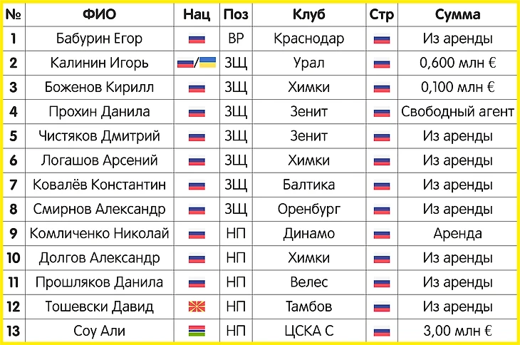 Помимо этого вернулись в клуб из аренд и готовы побороться за места в составе вратарь Егор Бабурин («Краснодар») и македонский нападающий Давид Тошевски («Тамбов»).