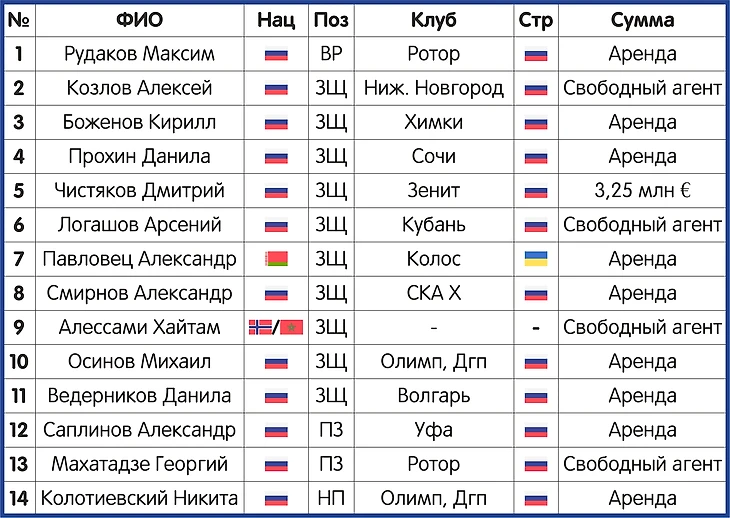 В очередные аренды ушли голкипер Максим Рудаков («Ротор»), защитники Александр Павловец (украинский «Колос») и Александр Смирнов («СКА», Хабаровск), полузащитник Александр Саплинов («Уфа»).