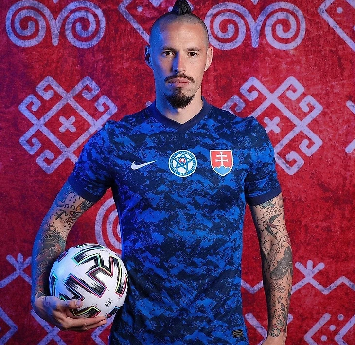 Форму сборной Словакии отличает расположение национальной символики. В большинстве случаев герб помещается слева, однако, у команды Словакии логотип федерации расположен по центру. Фишкой комплекта стал его принт, который выполнен в синих и голубых цветах и отдаленно напоминает горы, что является отсылкой к Карпатам, которые проходят через территорию Словакии.