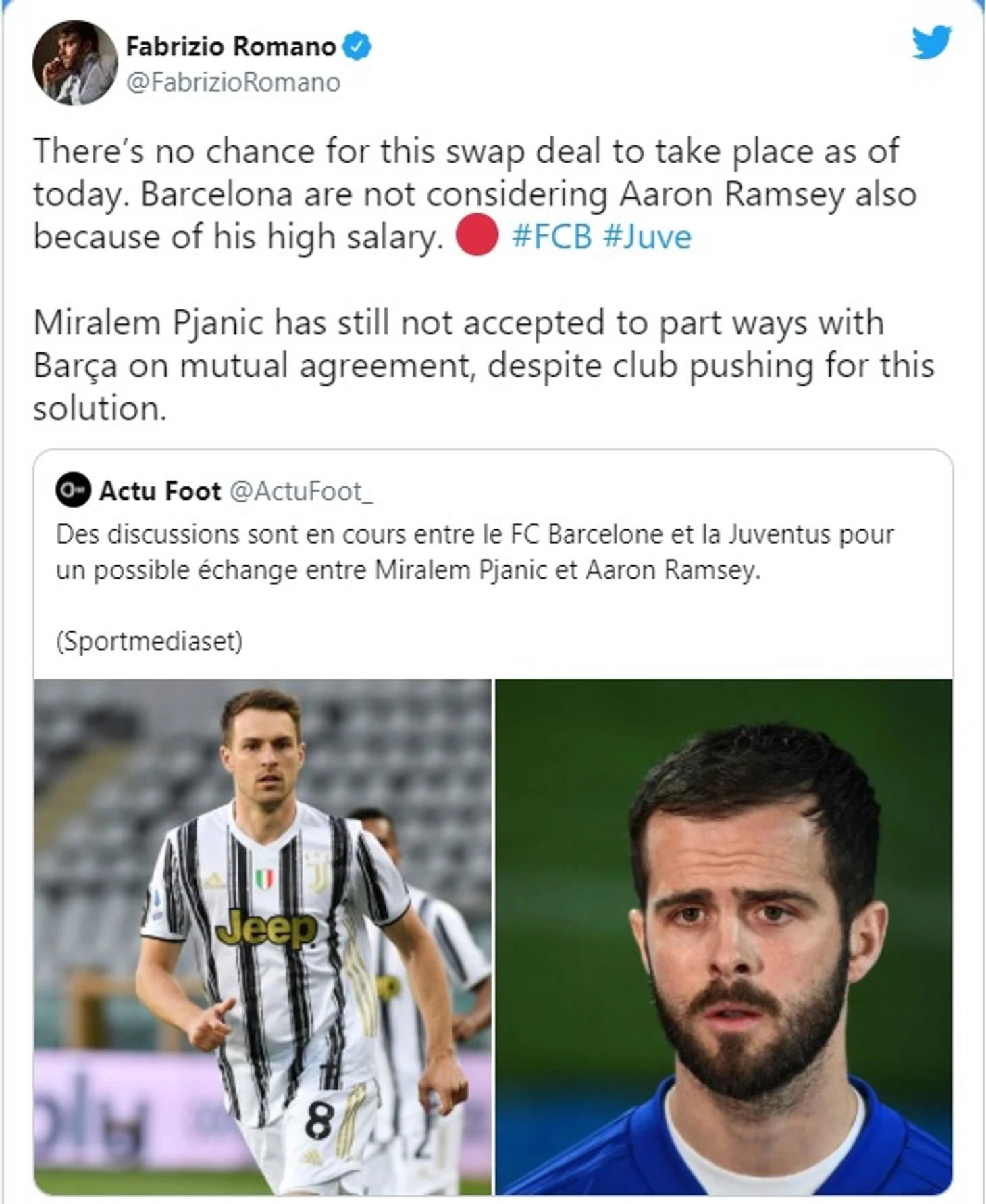 Фабрицио Романо опровергает слухи об обмене Рэмзи на Пьянича