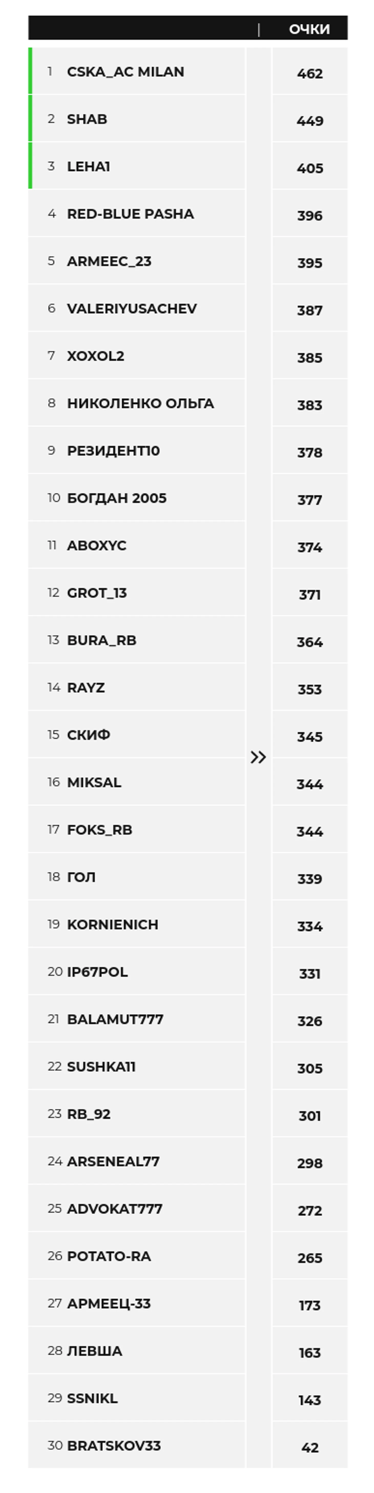 Самый результативный игрок по итогам 30 туров: kornienich (21 тур) и Xoxol2 (28 тур) - по 27 баллов!