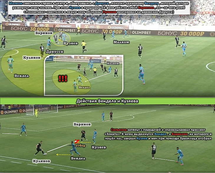 - Вендел и Кузяев делают разницу в середине. Причём каждый по-своему. Бразилец классно читает игру и контролирует её темп, грамотно и своевременно насыщая центр и освобождая фланг Дугласу. Кузяев наконец-то сыграл на любимой позиции в центре и выдал едва ли не образцовый бокс-ту-бокс перформанс, мощно отработав на обеих половинах поля.