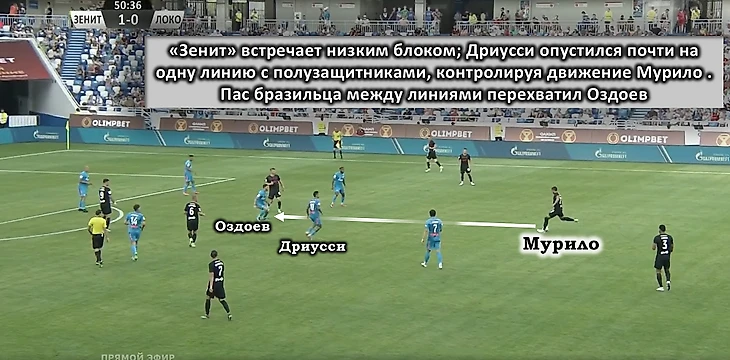 При этом прессинг-модель питерцы не возвели в абсолют: если не было возможности сыграть в давление, команда низким блоком опускалась в 4-4-2, минимизируя пространство между линиями. Иногда пятым в середину опускался и Дриусси, а Оздоев оказывался в плавающей позиции, контролируя действия игрока с мячом. Если он опрометчиво выдёргивался, за спиной получала пространство "десятка" "Локо" (Рифат/Антон) — и пара таких эпизодов закончилась опасными ударами.