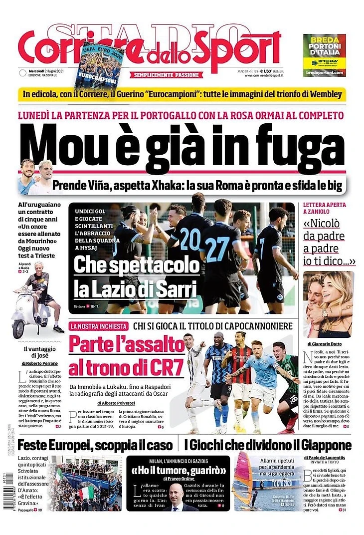 В понедельник отъезд в Португалию с почти укомплектованной командой. Он получил Винью, и ожидает Джаку: его «Рома» готова и сразится с лучшими. Уругваец подписал контракт на пять лет: «Горд тренироваться под руководством Моуриньо». Сегодня новый тест в Триесте.