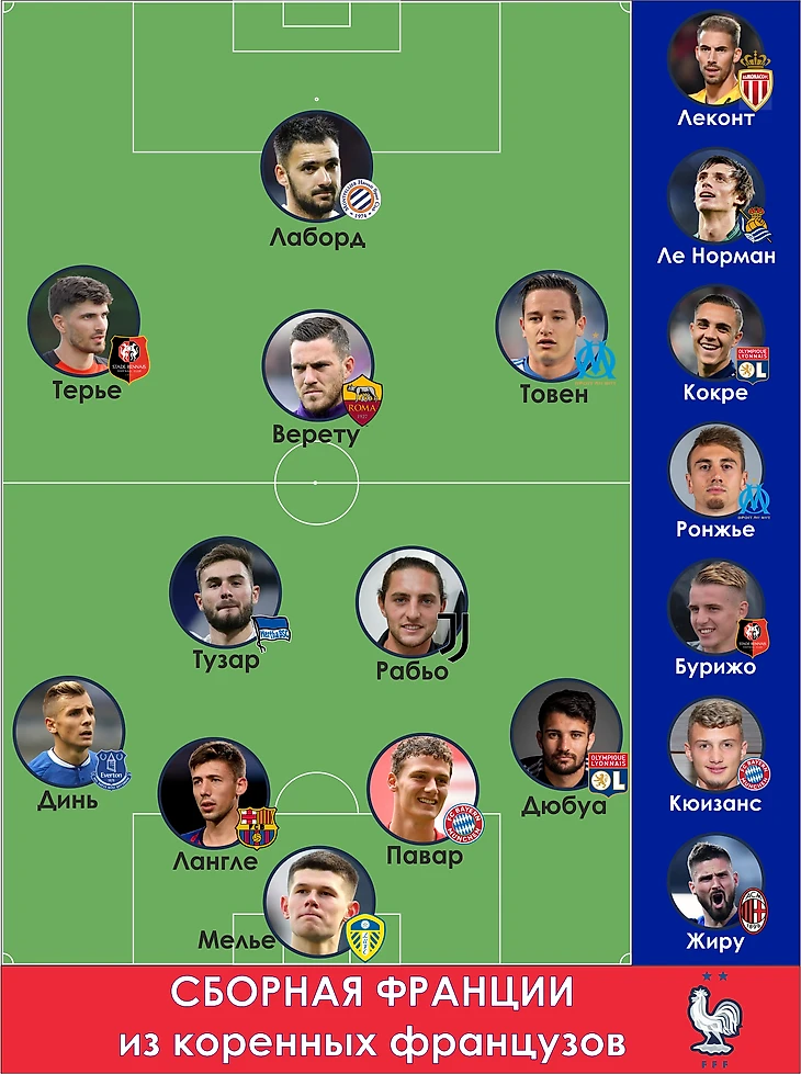 Африканские корни в нынешней сборной Франции имеют 12 человек – Нголо Канте, Муса Сиссоко (оба – Мали), Преснель Кимпембе, Стив Манданда (ДР Конго), Поль Погба (Гвинея), Усман Дембеле (Мавритания/Сенегал), Килиан Мбаппе (Камерун/Алжир), Жюль Кунде (Бенин), Курт Зума (Центральноафриканская Республика), Корентен Толиссо (Того), Карим Бензема (Алжир), Виссам Бен Йеддер (Тунис).