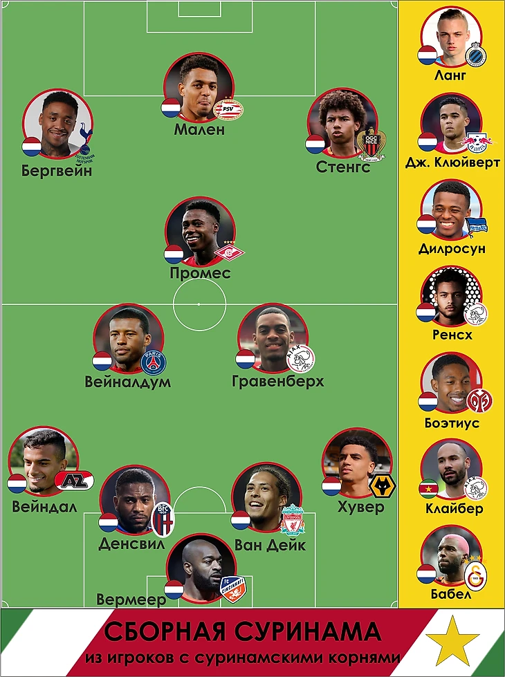Суринамское происхождение имеет большинство темнокожих игроков, когда-либо выступавших за сборную Голландии – легендарные Рууд Гуллит и Франк Райкаард, Эдгар Давидс, Кларенс Зеедорф, Джимми Флойд Хасселбайнк и другие. Патрик Клюйверт также имеет корни с острова Кюрасао – еще одного заморского владения Нидерландов. Сборную Кюрасао сегодня тренирует так любимый в России Гуус Хиддинк. Найджел Хасселбайнк, племянник знаменитого голландского форварда, выступает уже за сборную исторической родины.