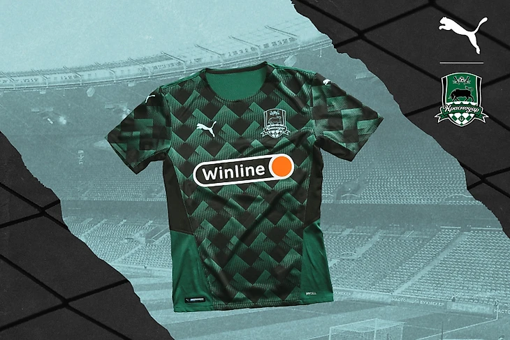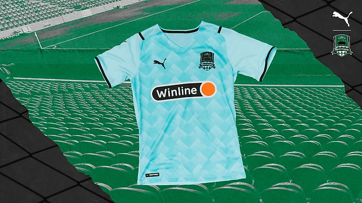 Форму "Краснодара" изготавливает "Puma". Домашний комплект выполнен в традиционном сочетании зелёного и черного цвета. А вот гостевая неожиданного светло-голубого цвета.