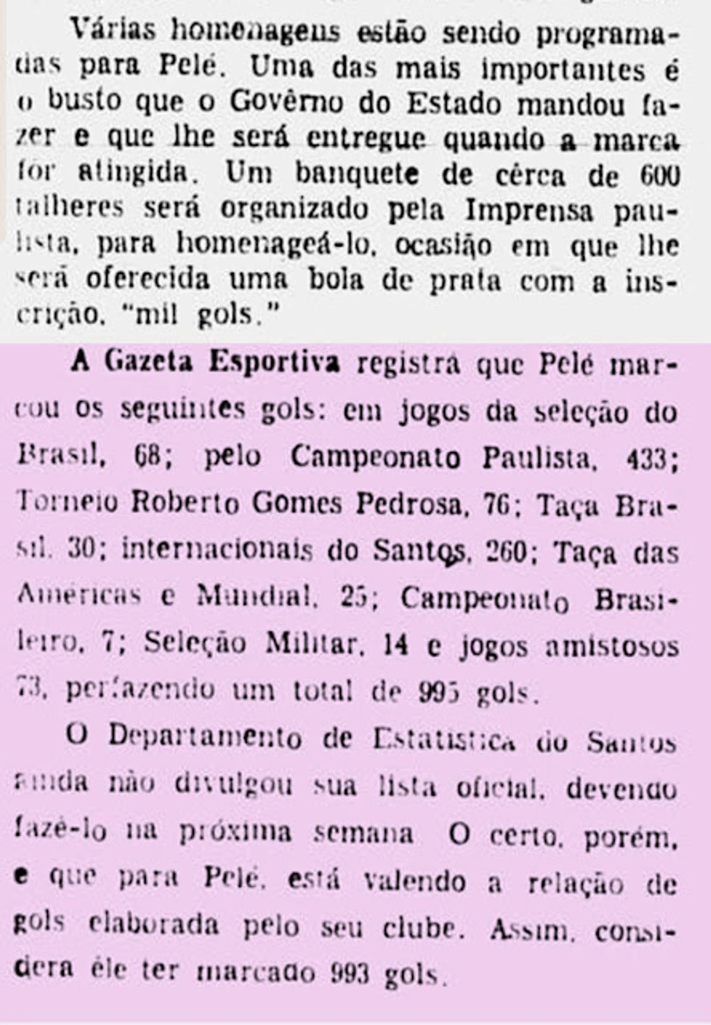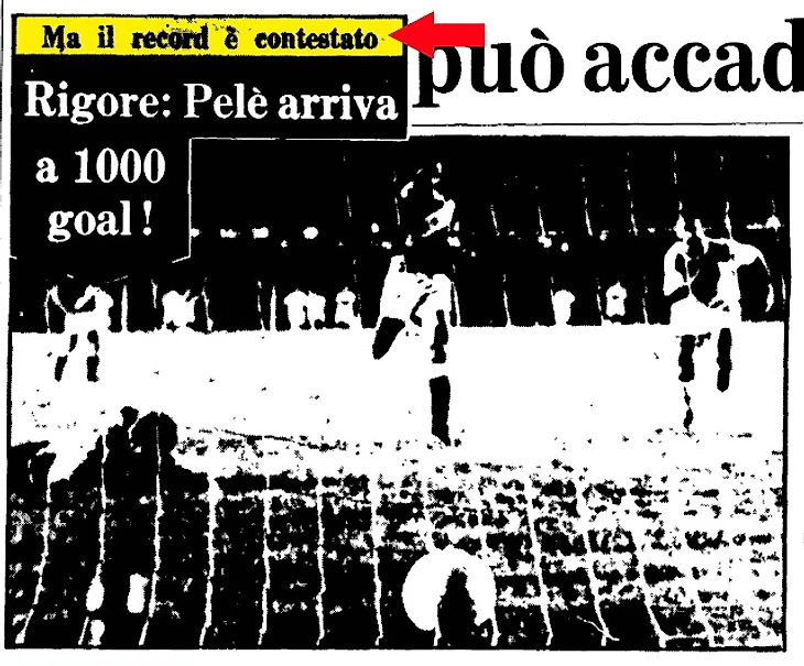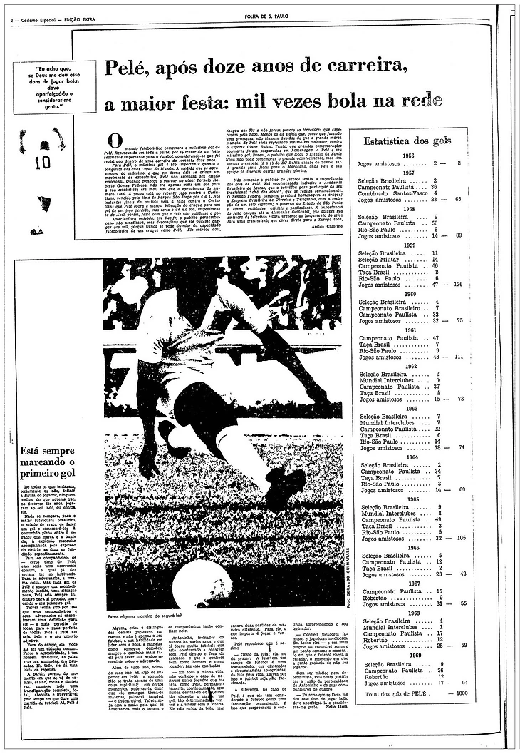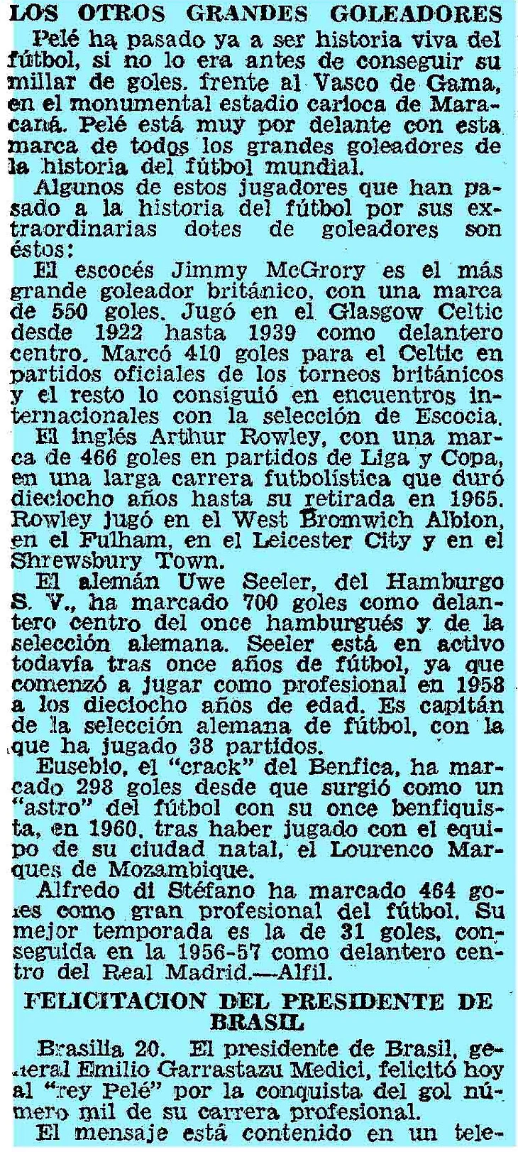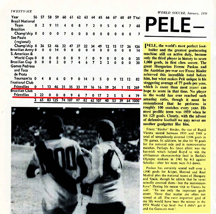 "Здесь необходимо прояснить. В Бразилии утверждалось что ещё один игрок до Пеле забил 1000 голов: это недавно скончавшийся Фриденрейх. Но крайне редкие сторонники этого рекорда могут подтвердить его фактами. - и это понятно, потому что во времена Фриденрайха не было серьезной работы со статистикой, а СМИ не были такими точными и скрупулезными, как сегодня. По мнению бразильских специалистов Фриденрайх не преодолел отметку в 364 мяча. ...Шотландец Джимми Мак Грори остается с 550 голами рекордсменом в истории Великобритании. .. Тысяча голов Пеле это результат ведения тщательной и подробной статистики с 1956 года. Заявление г-на Эрикса де Кастро, директора по статистике города Сантос, которое носит официальный характер, было опровергнуто нашим корреспондентом Томасом Маццони , известным статистиком, и 2 гола по мнению Маццони, должны быть добавлены к результату Пеле. "