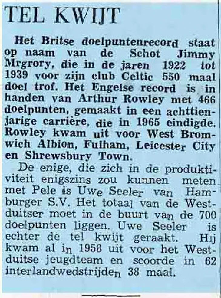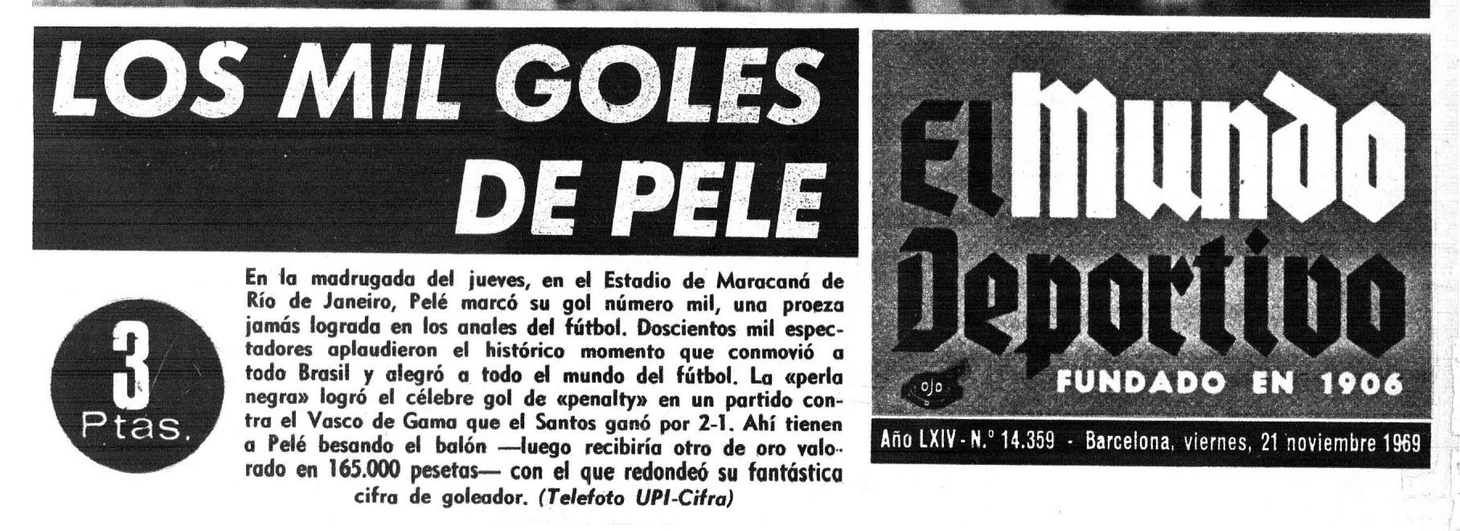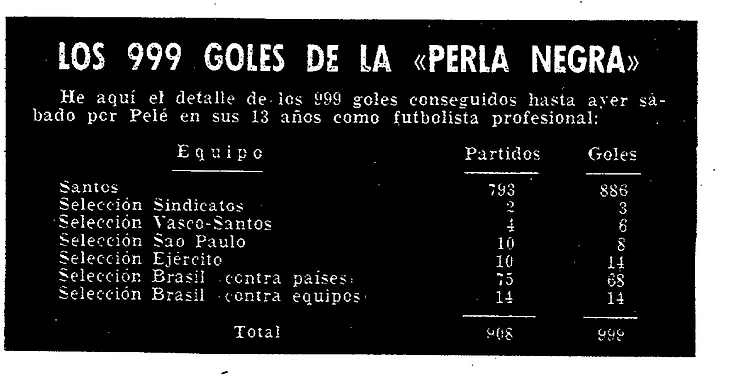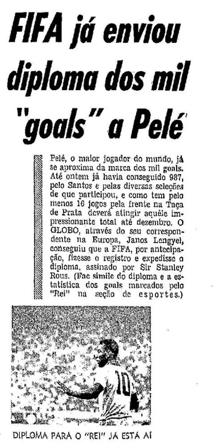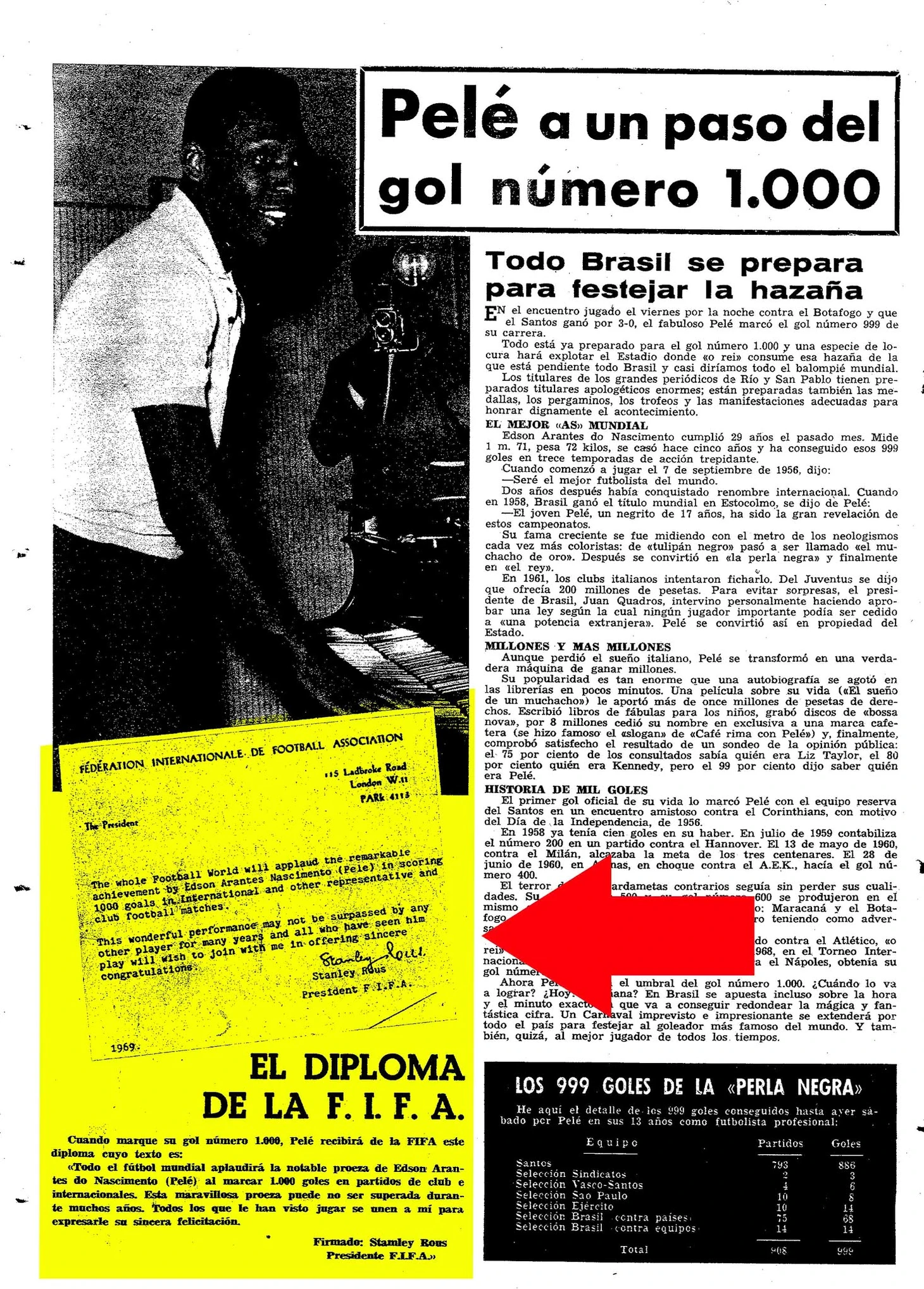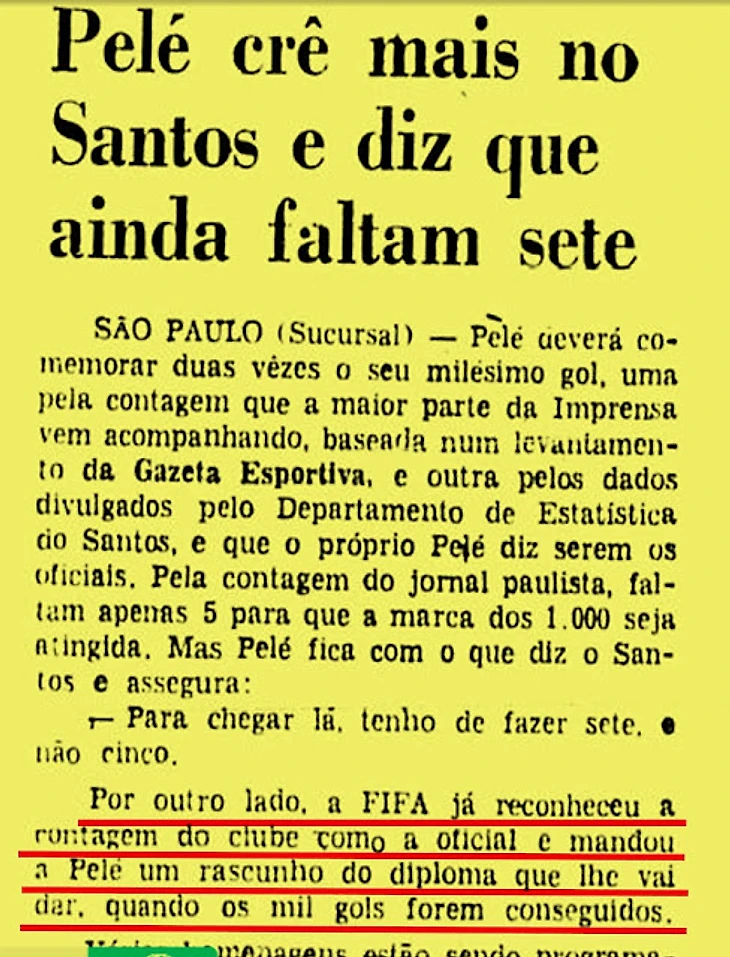 "Здесь необходимо прояснить. В Бразилии утверждалось что ещё один игрок до Пеле забил 1000 голов: это недавно скончавшийся Фриденрейх. Но крайне редкие сторонники этого рекорда могут подтвердить его фактами. - и это понятно, потому что во времена Фриденрайха не было серьезной работы со статистикой, а СМИ не были такими точными и скрупулезными, как сегодня. По мнению бразильских специалистов Фриденрайх не преодолел отметку в 364 мяча. ...Шотландец Джимми Мак Грори остается с 550 голами рекордсменом в истории Великобритании. .. Тысяча голов Пеле это результат ведения тщательной и подробной статистики с 1956 года. Заявление г-на Эрикса де Кастро, директора по статистике города Сантос, которое носит официальный характер, было опровергнуто нашим корреспондентом Томасом Маццони , известным статистиком, и 2 гола по мнению Маццони, должны быть добавлены к результату Пеле. "