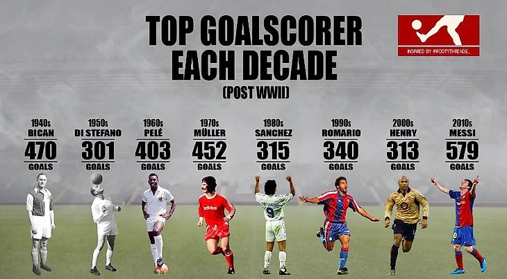 Есть конечно вот такая ересь в соцсетях с разбивкой по десятилетиям. Народ не проверяет ни цифры Месси, ни знает, что Динамит в 80-ые забил куда больше Марадоны - но в данных картинках важнее узнаваемость имен, чем точные цифры и правда.