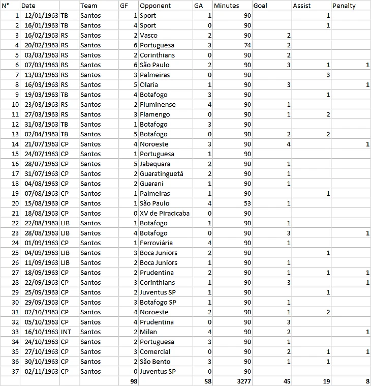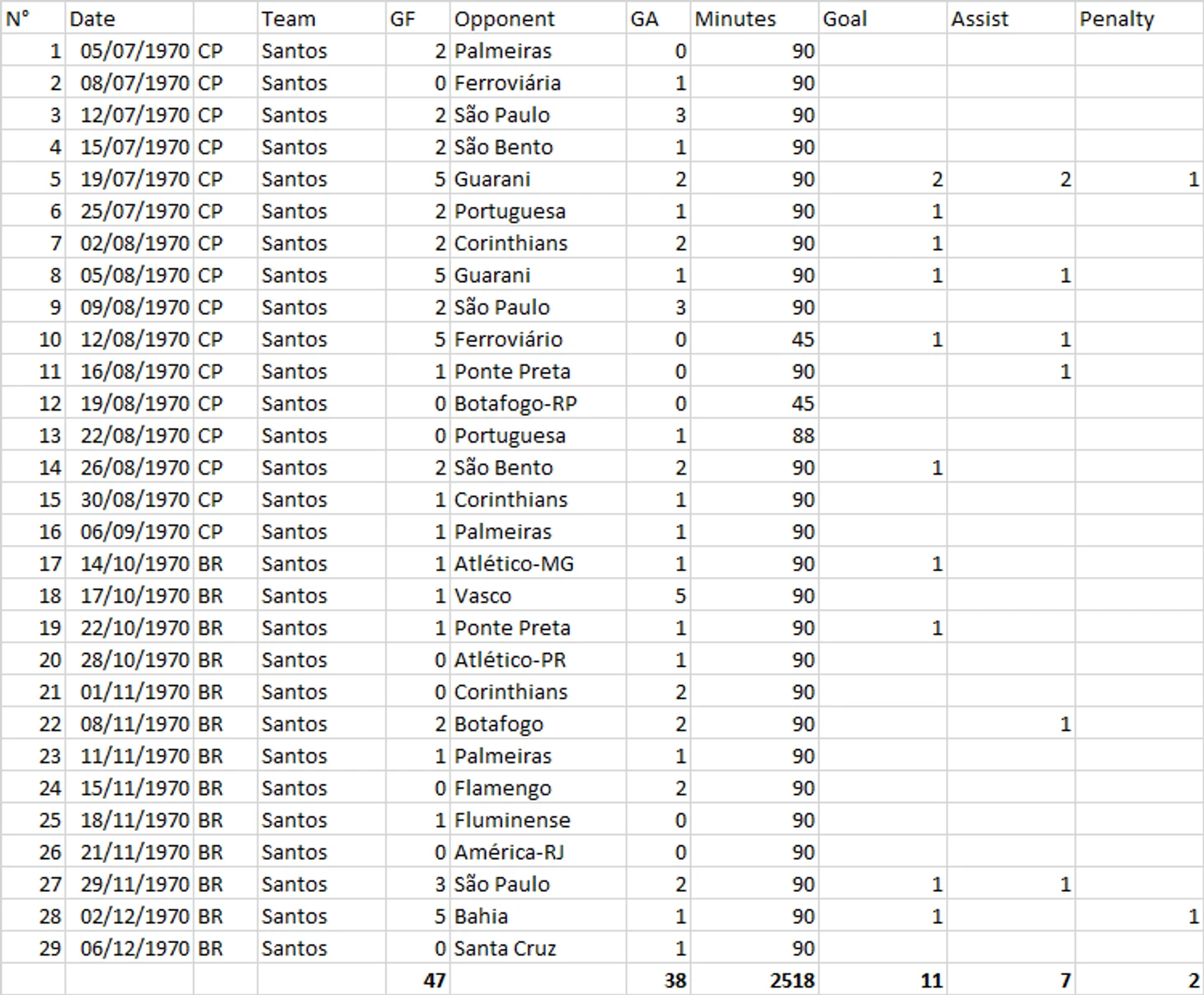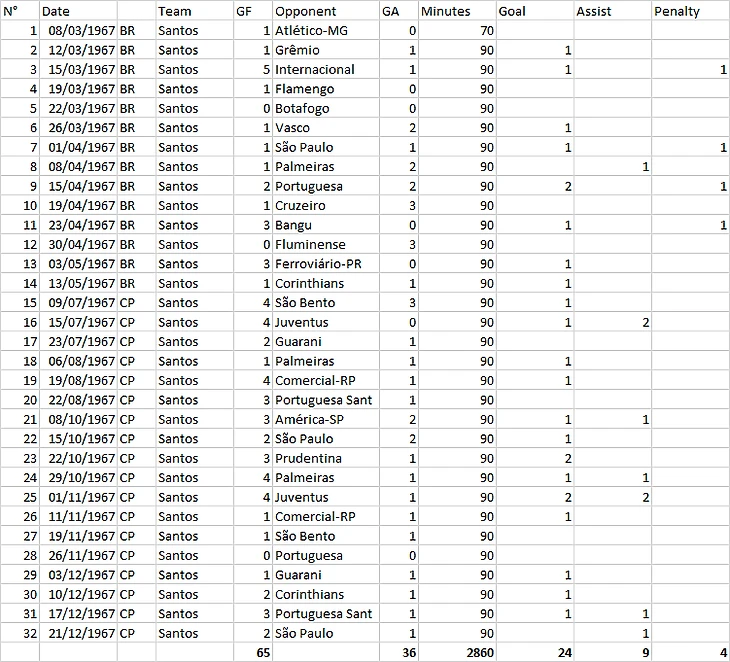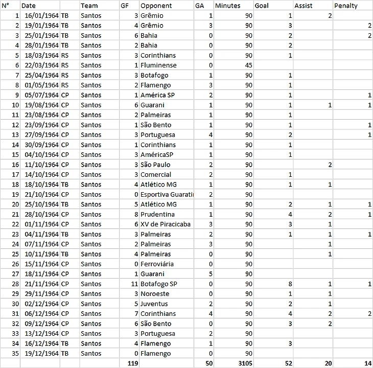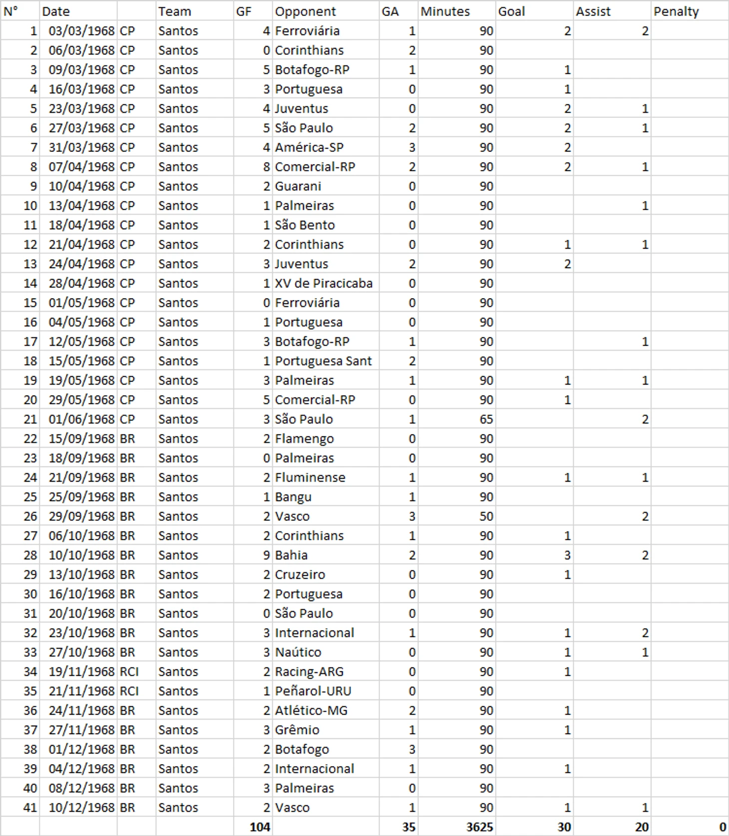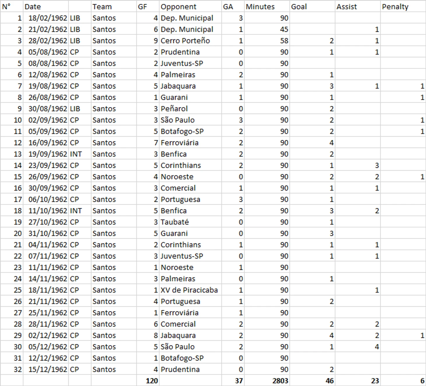 И вот мы подходим ко второй части сегодняшнего исследования. Как я давно анонсировал, это голы и передачи Пеле. Пока это голы в официальных матчах на бразильском этапе карьеры. Та самая терра инкогнита для многих. Ведь нет и не было понимания-а как регистрировались тогда голы, была статистика,как она велась? Отвечаю-была и велась. Велся даже подсчет голевых передач. Но с одним но. ТОГДА голевыми передачами не считались подачи со стандартов-штрафных, свободных или угловых. Они таковыми стали считаться только последние лет 15-20, потом "звездам" недавнего прошлого пересчитывались показатели и вырастало количество этих ассистов. Как по мне это глупость. Объясняю свою точку зрения - со стандарта ты подаешь в 95% случаев согласно заготовкам с тренировок. А там как правило 3 варианта-кто-то выскакивает на переднюю штангу,кто-то замыкает дальнюю, ну и пара человек-непосредственные адресаты. Это для того, чтобы снизить риск возможного технического брака подающего- недобил или перебил основное скопление народа в штрафной, и не страшно, там есть варианты. Да и при всем уважении к супертехничным игрокам верить, что они с 30 метров, выполняя угловой в скопление 14-16 игроков, целили именно в голову того, кто забил.....ну такое себе. Но никого переубеждать не собираюсь. Как говорится ИМХО- "И Меня Х Оспоришь".