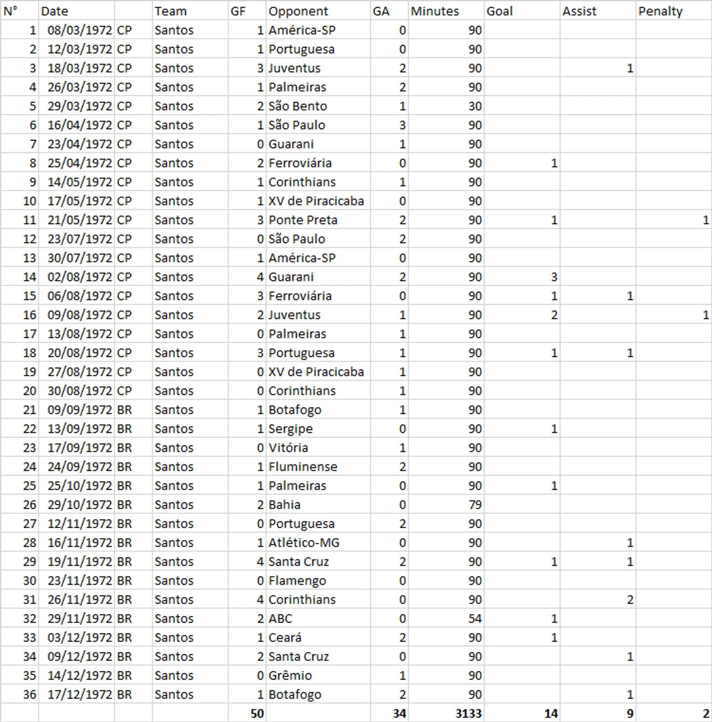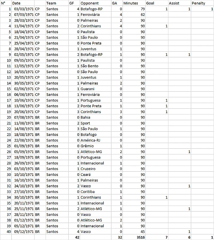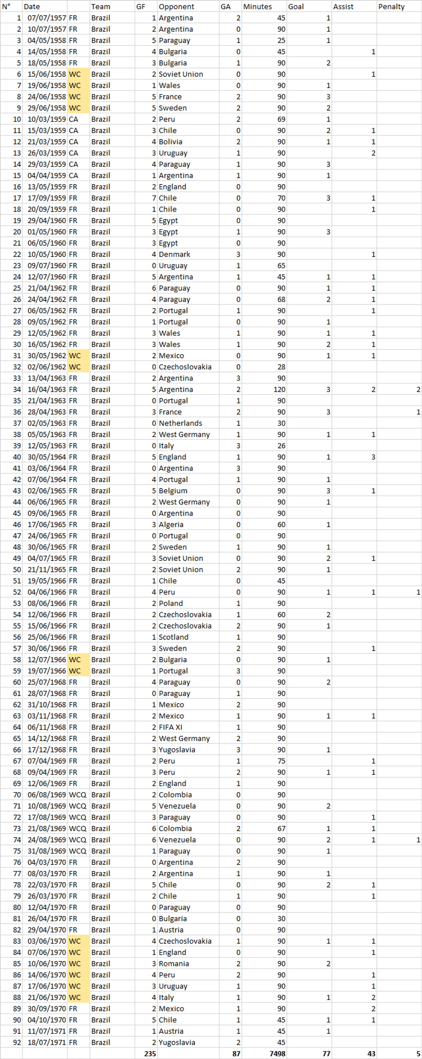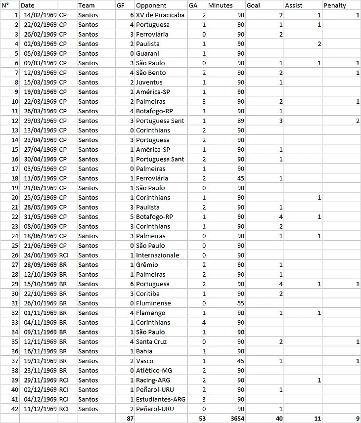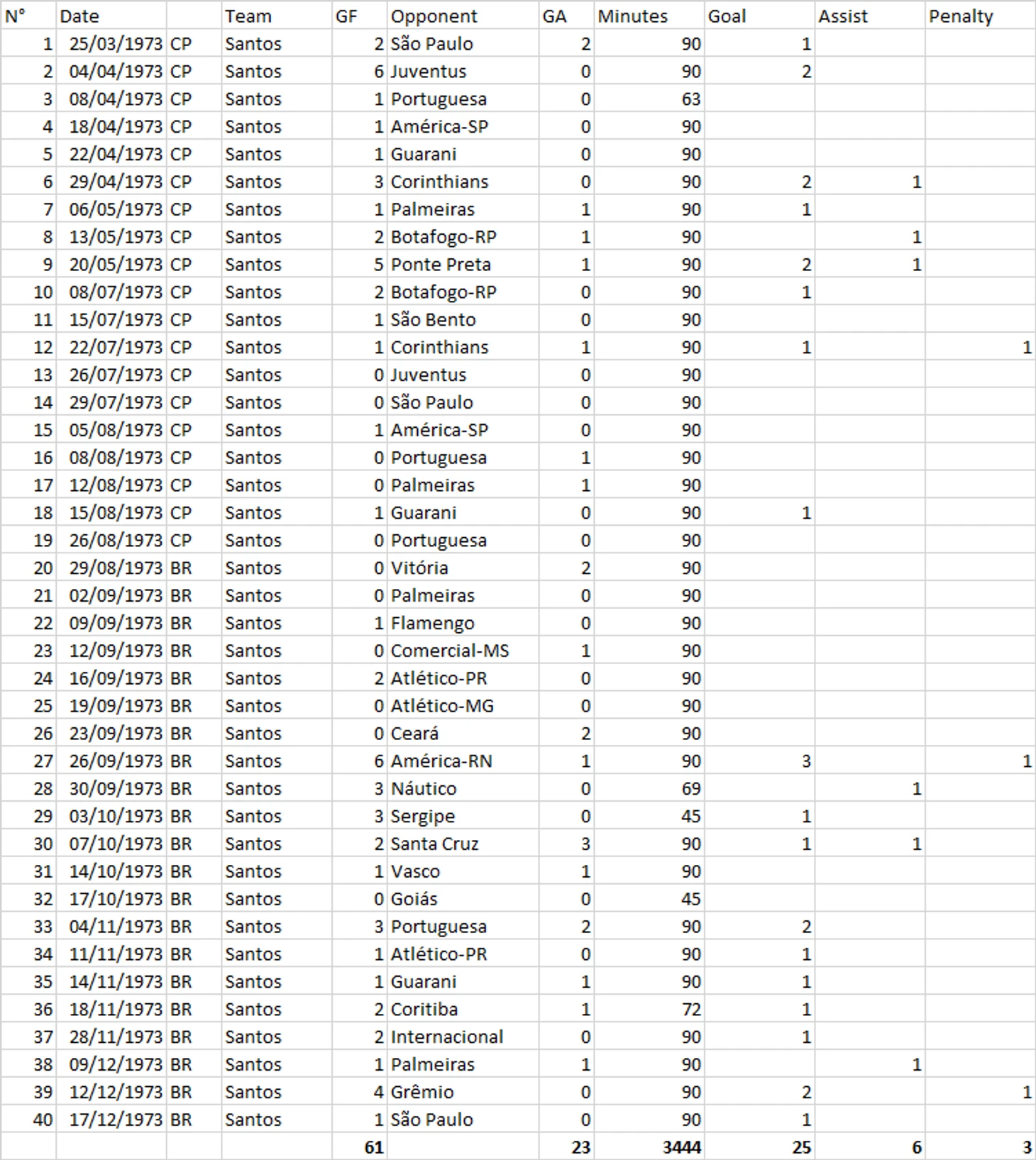 И вот мы подходим ко второй части сегодняшнего исследования. Как я давно анонсировал, это голы и передачи Пеле. Пока это голы в официальных матчах на бразильском этапе карьеры. Та самая терра инкогнита для многих. Ведь нет и не было понимания-а как регистрировались тогда голы, была статистика,как она велась? Отвечаю-была и велась. Велся даже подсчет голевых передач. Но с одним но. ТОГДА голевыми передачами не считались подачи со стандартов-штрафных, свободных или угловых. Они таковыми стали считаться только последние лет 15-20, потом "звездам" недавнего прошлого пересчитывались показатели и вырастало количество этих ассистов. Как по мне это глупость. Объясняю свою точку зрения - со стандарта ты подаешь в 95% случаев согласно заготовкам с тренировок. А там как правило 3 варианта-кто-то выскакивает на переднюю штангу,кто-то замыкает дальнюю, ну и пара человек-непосредственные адресаты. Это для того, чтобы снизить риск возможного технического брака подающего- недобил или перебил основное скопление народа в штрафной, и не страшно, там есть варианты. Да и при всем уважении к супертехничным игрокам верить, что они с 30 метров, выполняя угловой в скопление 14-16 игроков, целили именно в голову того, кто забил.....ну такое себе. Но никого переубеждать не собираюсь. Как говорится ИМХО- "И Меня Х Оспоришь".