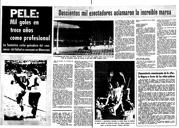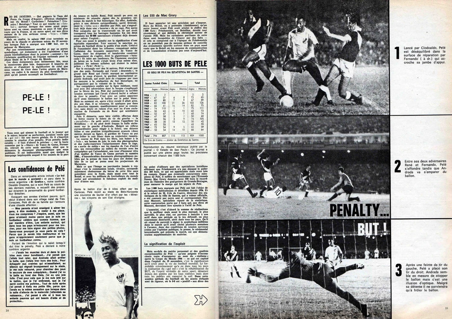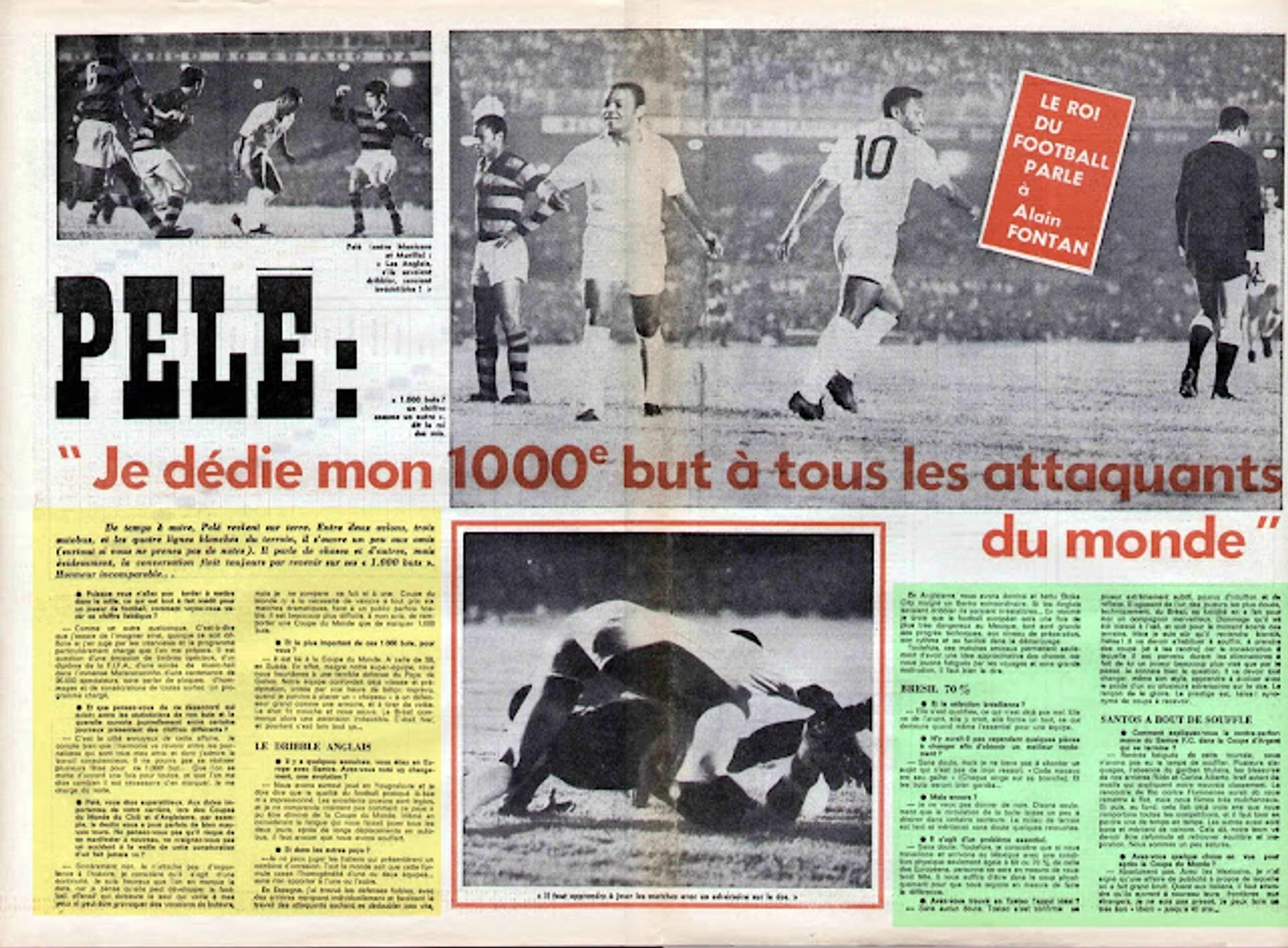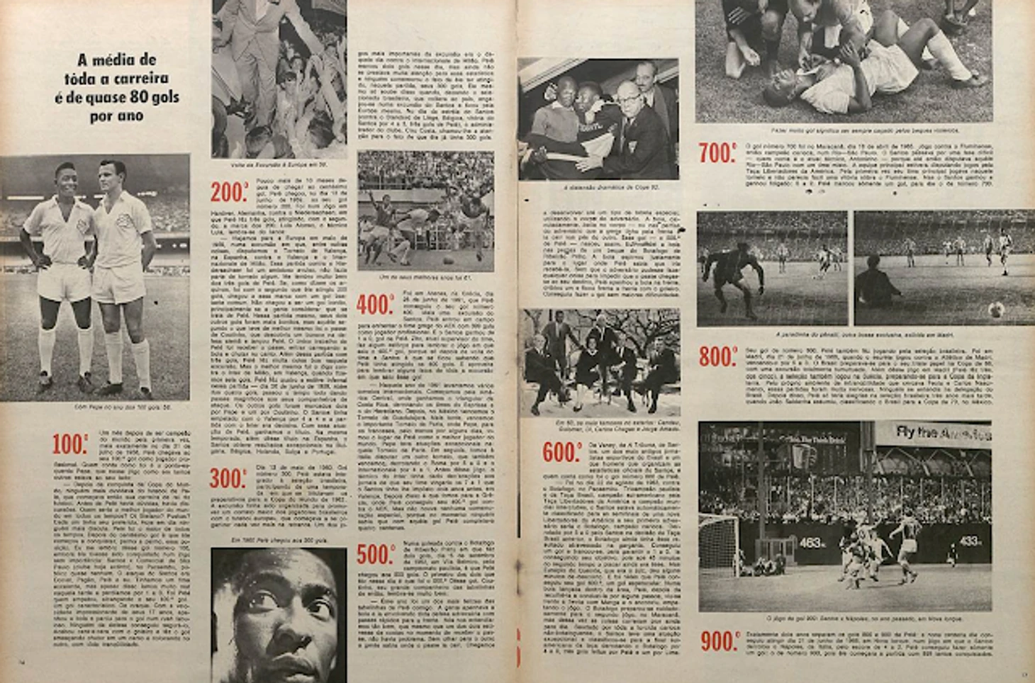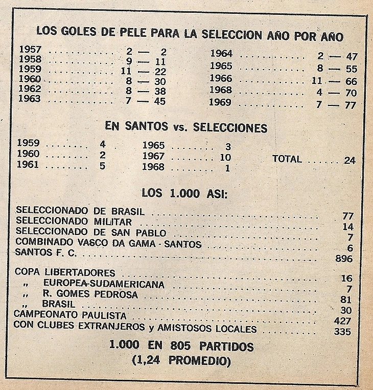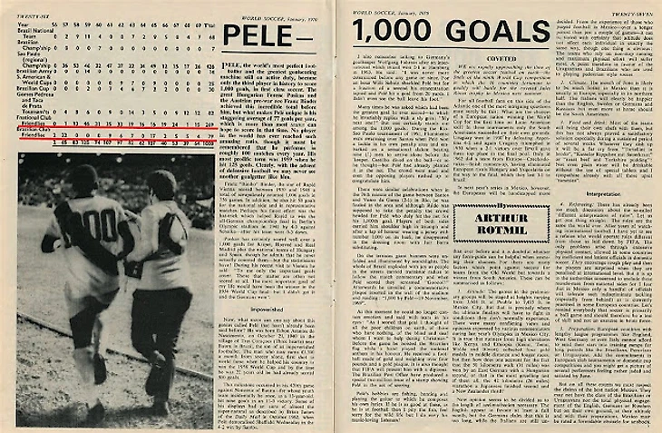 «Пеле, самый совершенный футболист и лучший бомбардир из тех играют, но он лишь третий игрок в истории, забившим 1000 голов в элитном футболе. Великий венгр Ференц Пушкаш и австрийская звезда довоенного периода Франц Биндер достигли этого невероятного результата раньше него, но уникальность Пеле заключается в том, что он забивает в среднем 77 голов в год, что больше, чем большинство команд забивают за сезон. Ни один игрок в мире никогда не достигал этого невероятного среднего показателя, хотя стоит помнить, что Пеле играет около 100 матчей в год. Его самый плодотворный период был в 1959 году, когда он забил 125 голов. Очевидно, что с преобладанием оборонительного футбола мы, возможно, больше никогда не увидим другого такого бомбардира, как он...