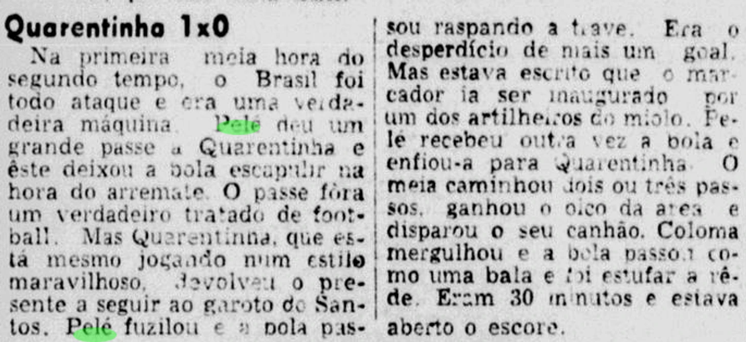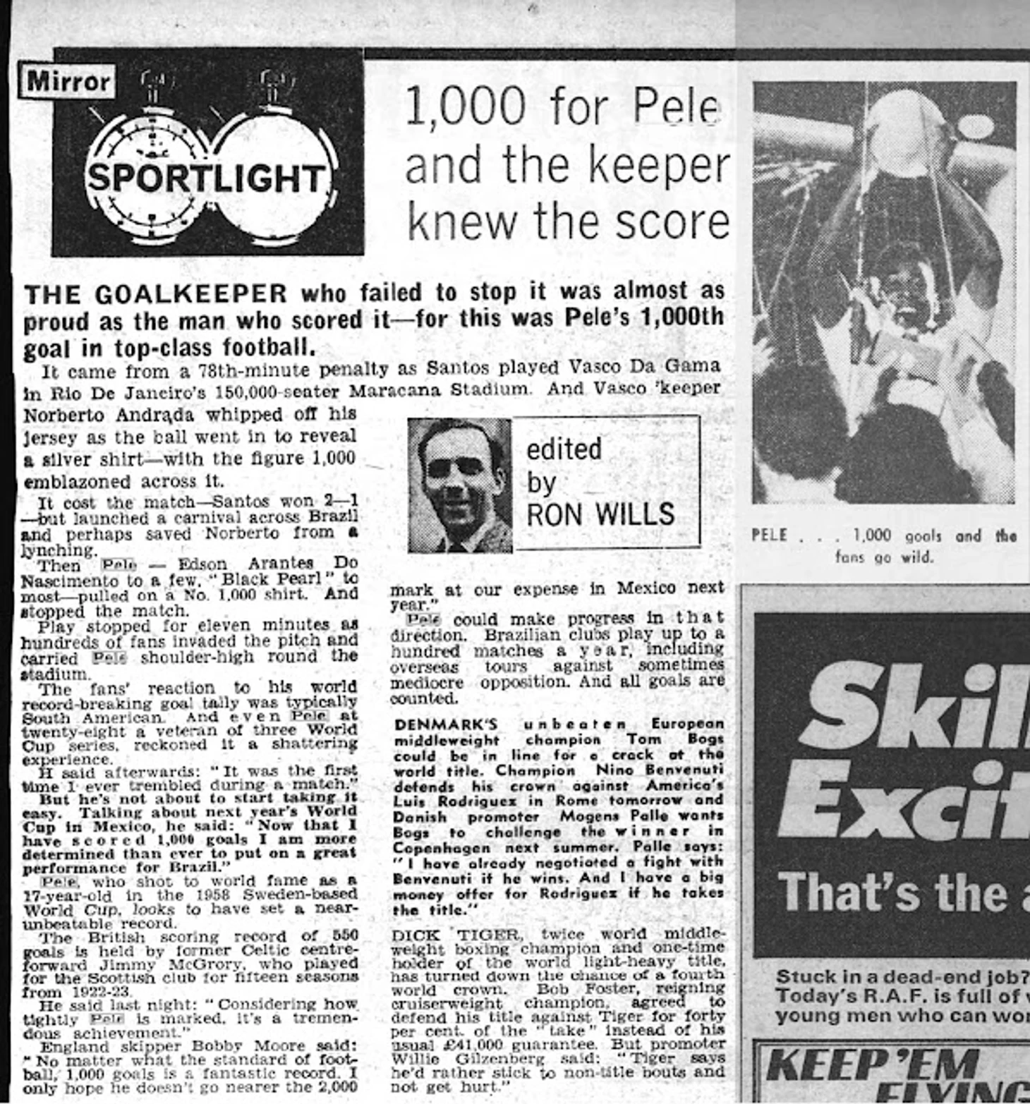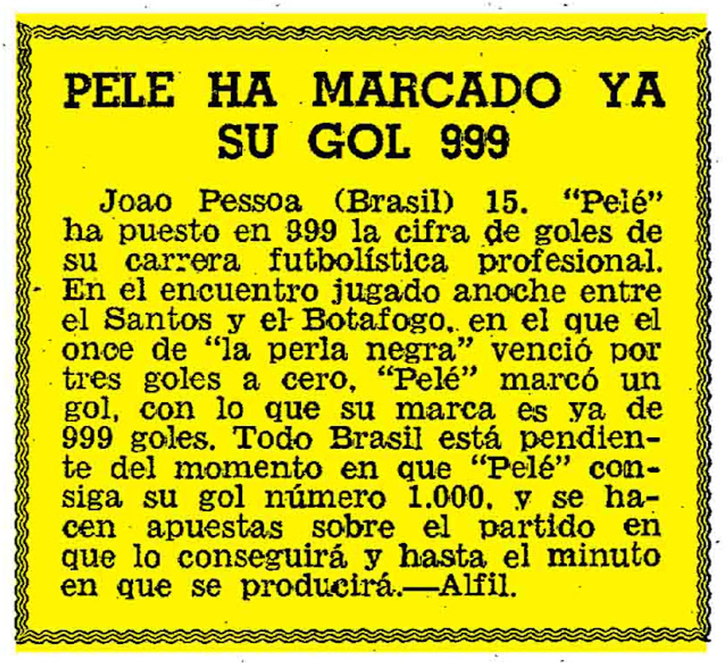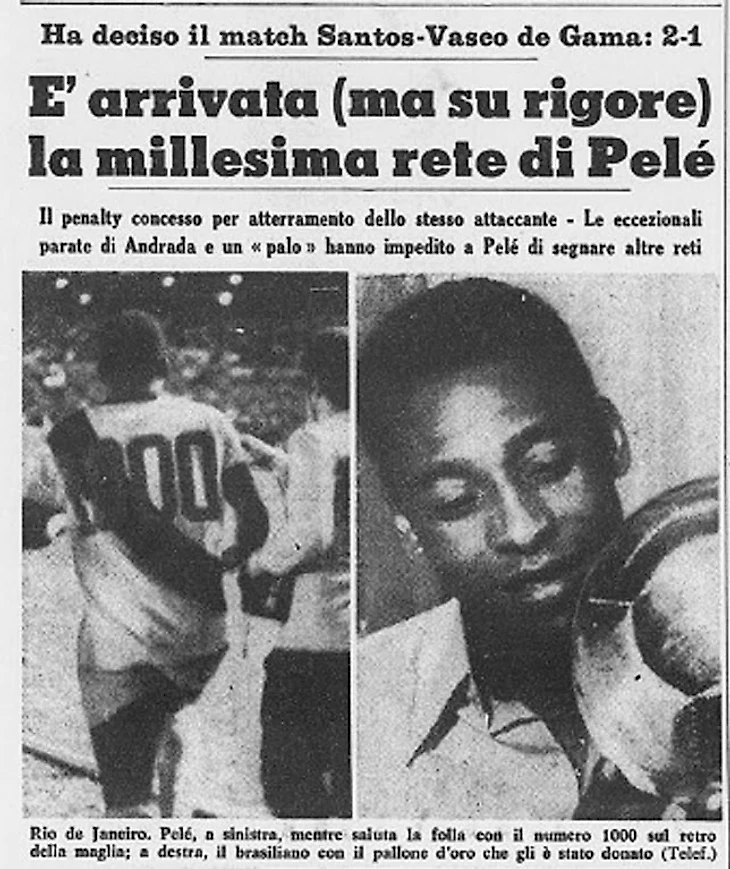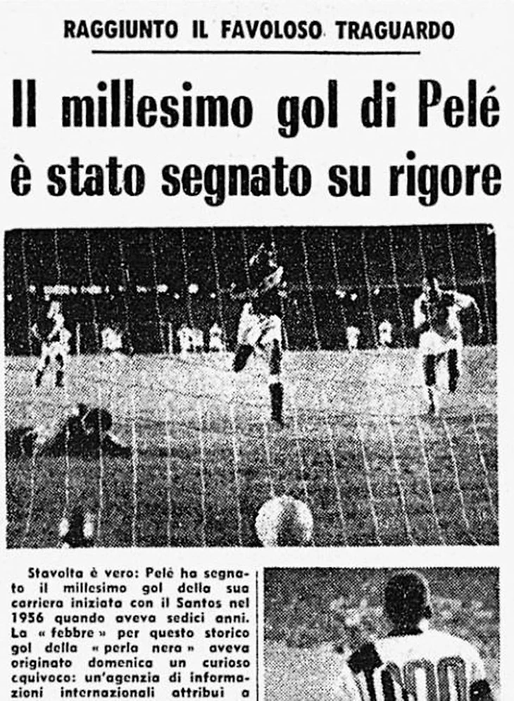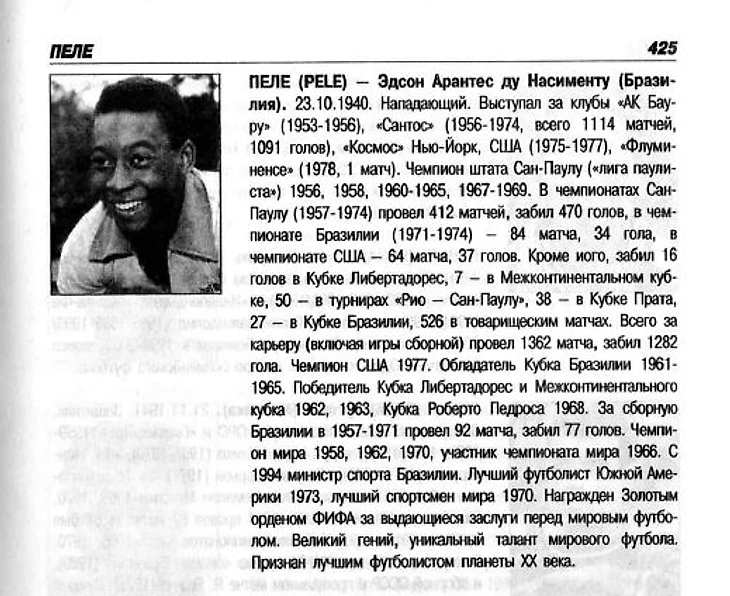 «Пеле, самый совершенный футболист и лучший бомбардир из тех играют, но он лишь третий игрок в истории, забившим 1000 голов в элитном футболе. Великий венгр Ференц Пушкаш и австрийская звезда довоенного периода Франц Биндер достигли этого невероятного результата раньше него, но уникальность Пеле заключается в том, что он забивает в среднем 77 голов в год, что больше, чем большинство команд забивают за сезон. Ни один игрок в мире никогда не достигал этого невероятного среднего показателя, хотя стоит помнить, что Пеле играет около 100 матчей в год. Его самый плодотворный период был в 1959 году, когда он забил 125 голов. Очевидно, что с преобладанием оборонительного футбола мы, возможно, больше никогда не увидим другого такого бомбардира, как он...