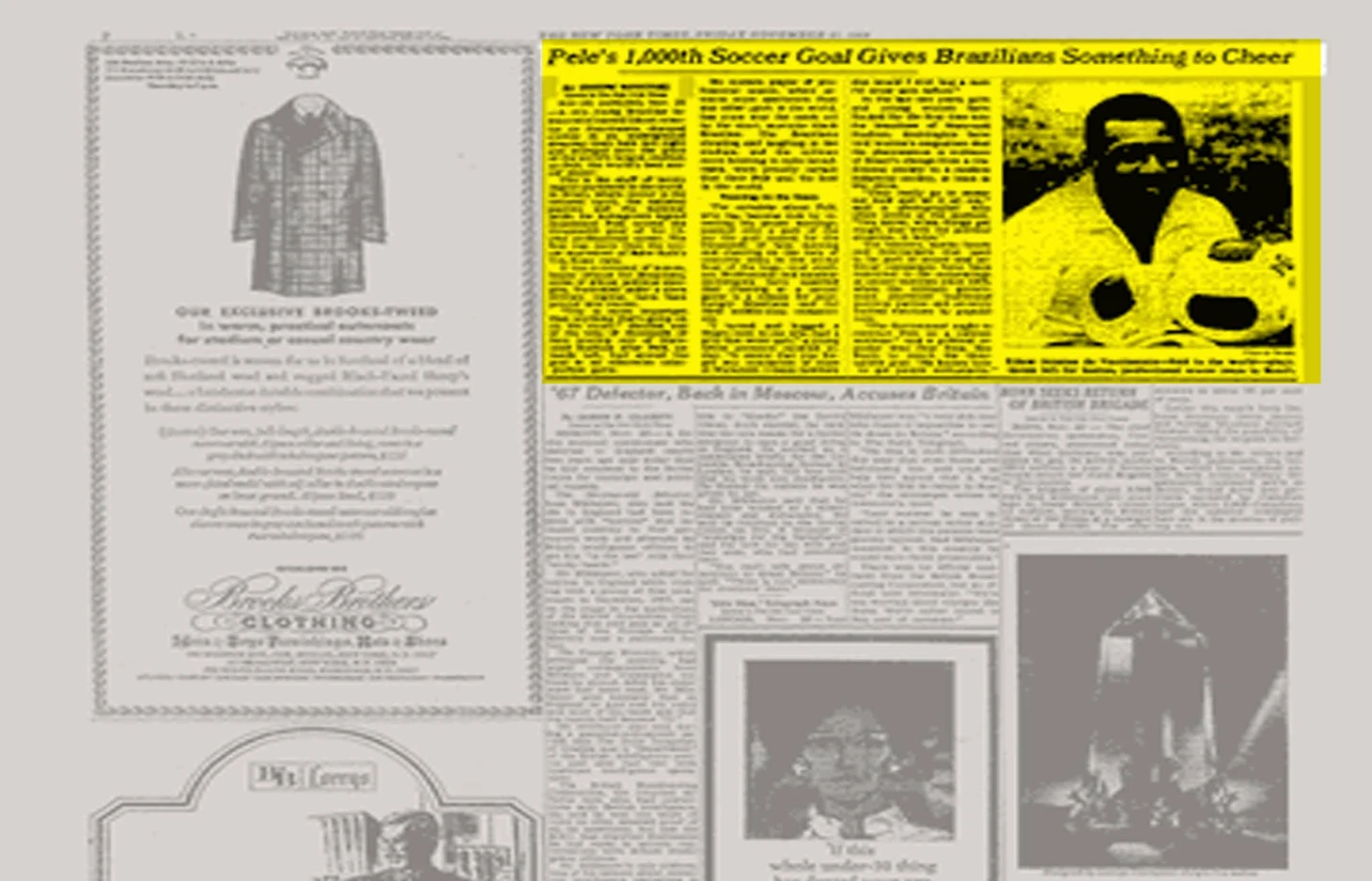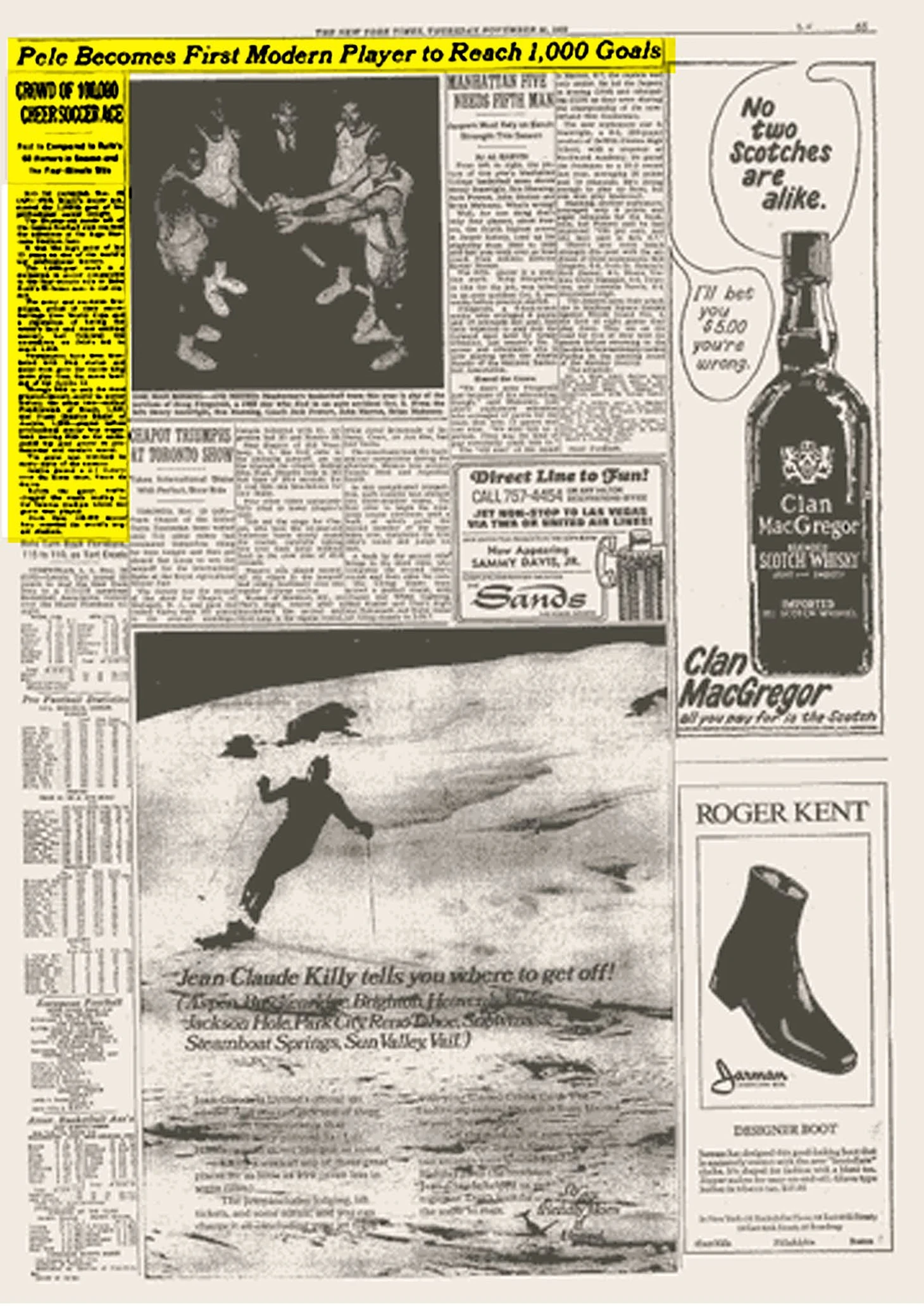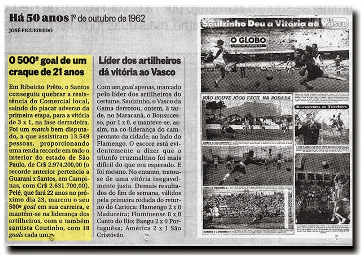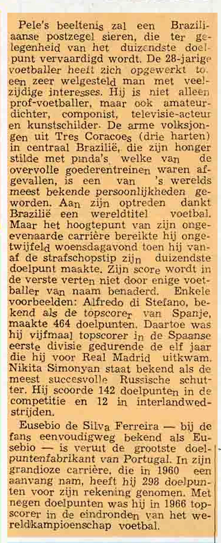 «Пеле, самый совершенный футболист и лучший бомбардир из тех играют, но он лишь третий игрок в истории, забившим 1000 голов в элитном футболе. Великий венгр Ференц Пушкаш и австрийская звезда довоенного периода Франц Биндер достигли этого невероятного результата раньше него, но уникальность Пеле заключается в том, что он забивает в среднем 77 голов в год, что больше, чем большинство команд забивают за сезон. Ни один игрок в мире никогда не достигал этого невероятного среднего показателя, хотя стоит помнить, что Пеле играет около 100 матчей в год. Его самый плодотворный период был в 1959 году, когда он забил 125 голов. Очевидно, что с преобладанием оборонительного футбола мы, возможно, больше никогда не увидим другого такого бомбардира, как он...