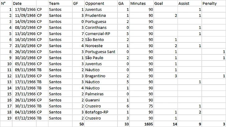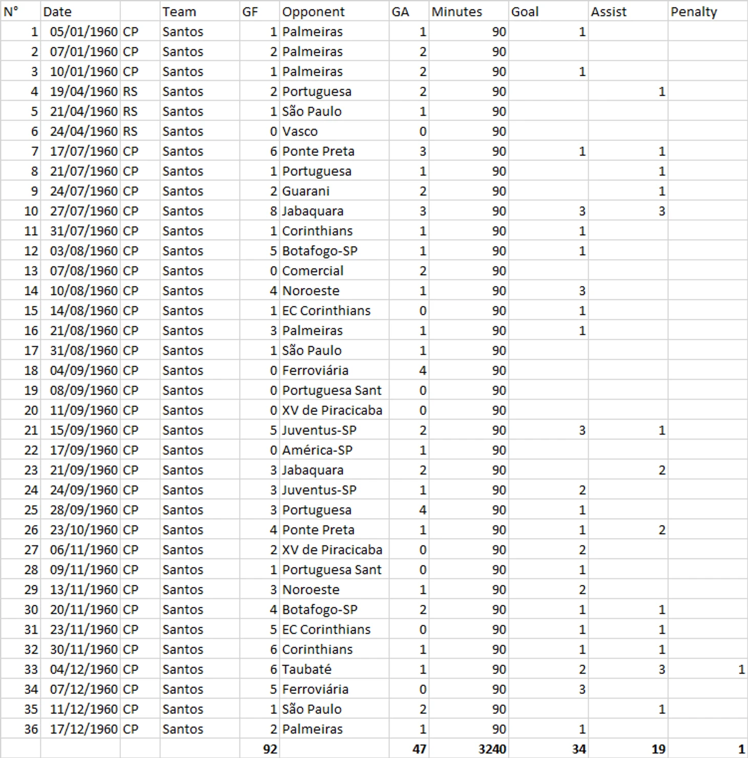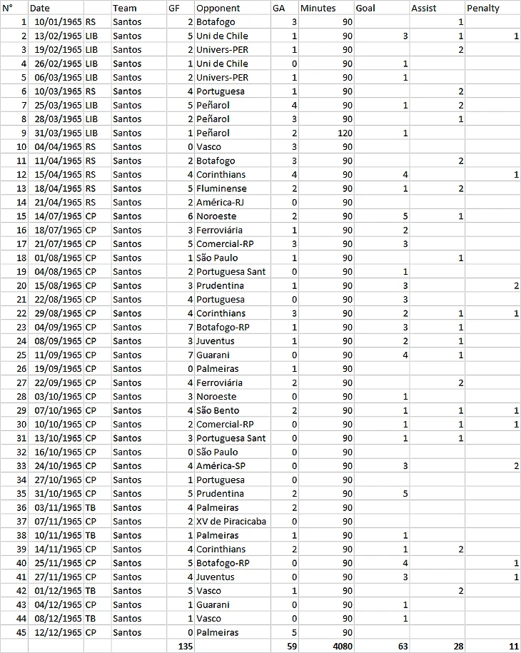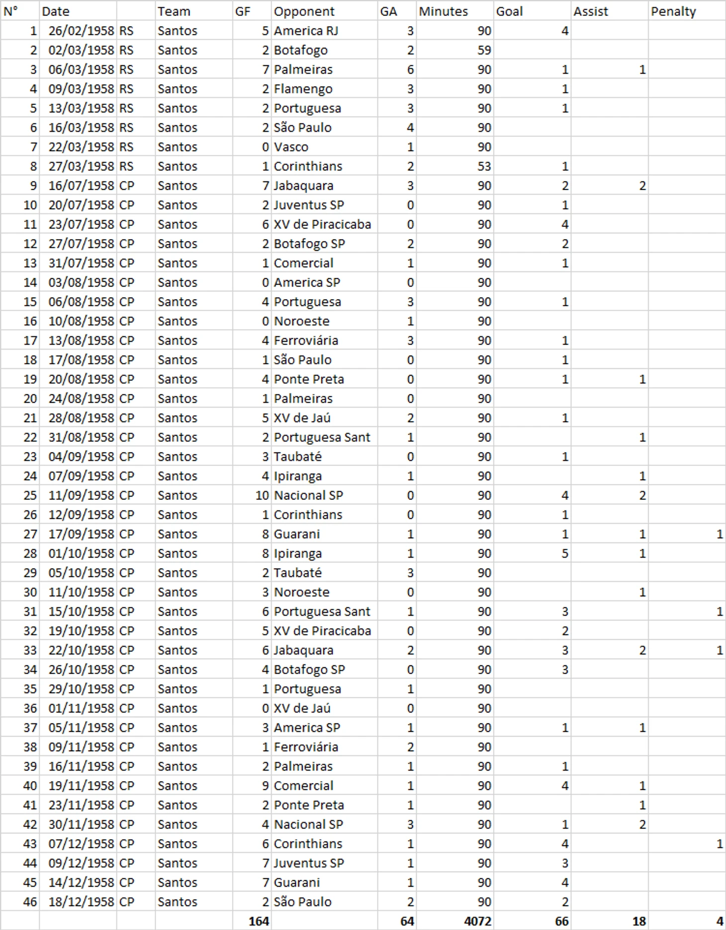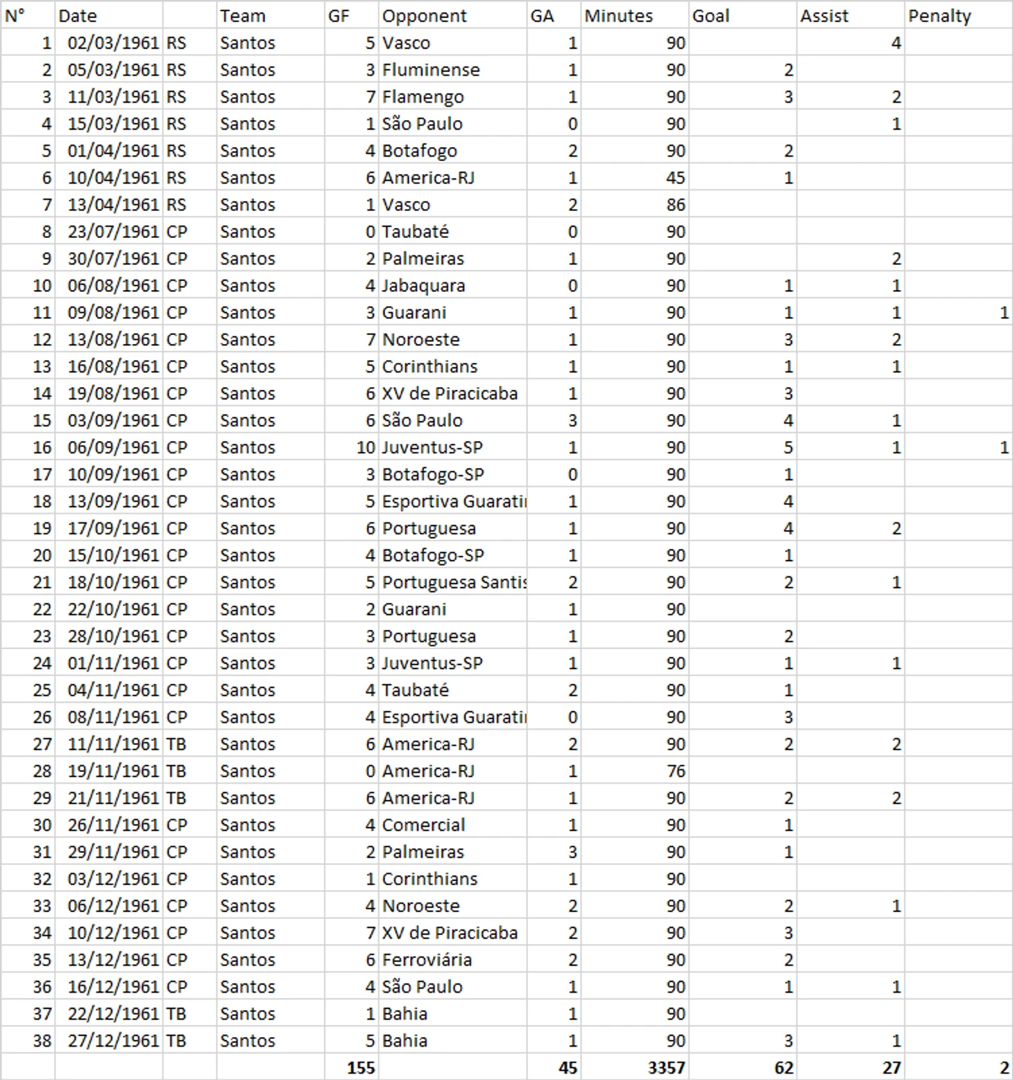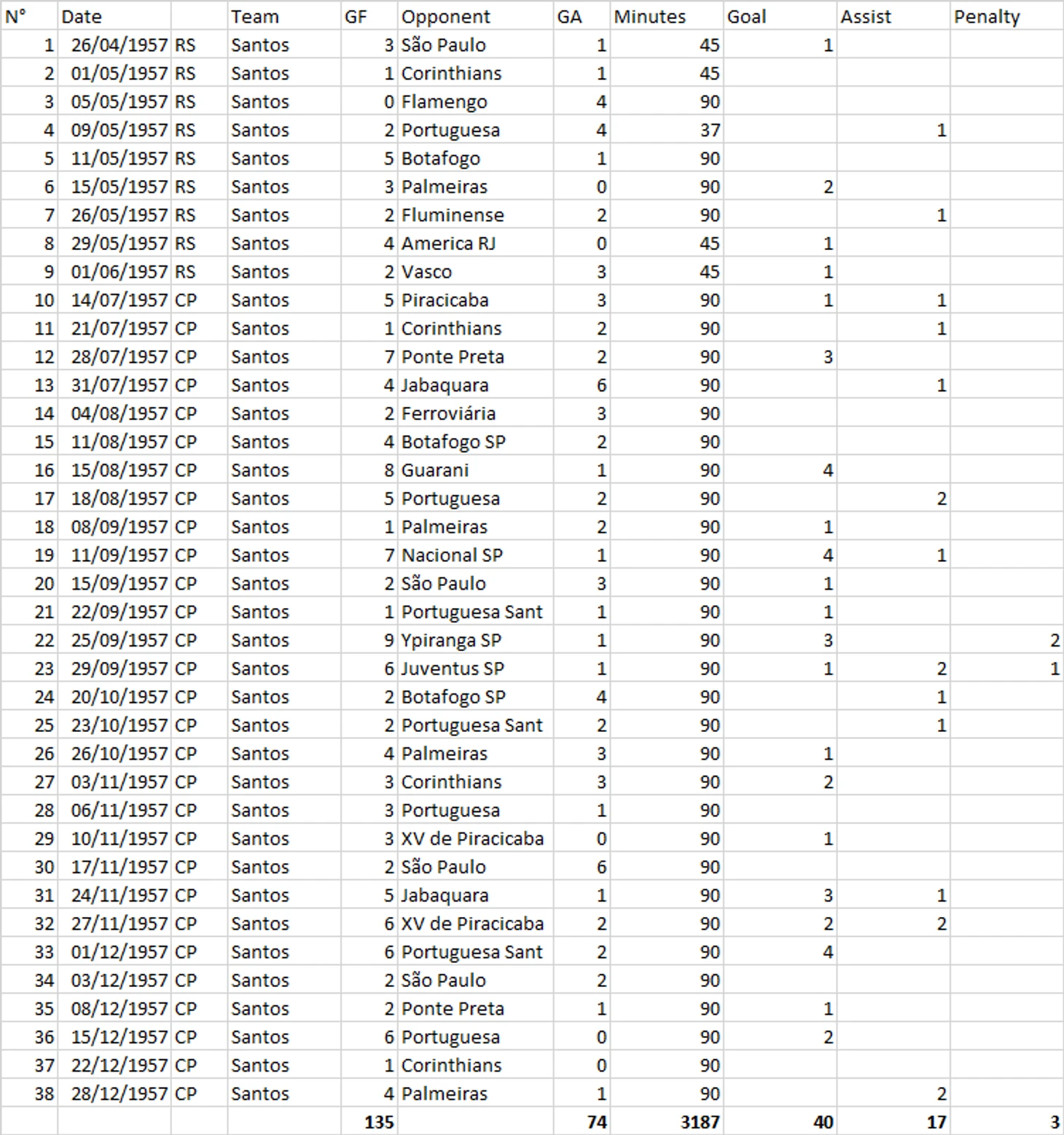 Понятно, что я не буду забивать здесь место десятками сканов и ссылок, вы и сами можете перейти по ним и все рассмотреть при желании. Я дам по сезонам результативность Пеле. Единственное-выпадает 1959 год, оцифрованных газет Сан-Паулу за этот год удалось найти мало, в основном работа шла с Jornal dos Sports из Рио, а там очень и очень сухо и скупо. Поэтому голевых передач за этот год по факту нет. Надеемся,что Томас Росолино все же восполнит этот пробел и найдет в архивах нужную информацию.
